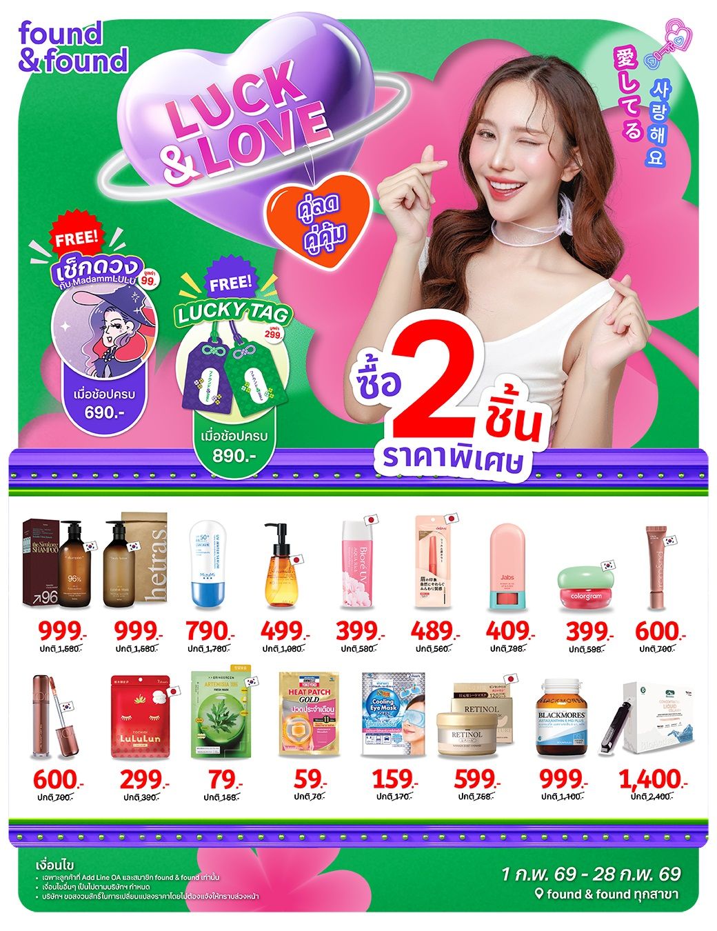 found & found ชวนเติมสวยรับความปังตลอดเดือนแห่งความรักนี้ ด้วยโปรโมชันสุดคุ้ม Luck & Love คู่ลด คู่คุ้ม เติมความสุขแบบ one stop shopping ให้กับ สายมู สายช้อป ได้สวยครบ ดูดี เฮลตี้ ที่นี่ทุกวัน ร้านเดียวที่จะพาทุกคนช้อปปิ้งครบจบทุกแบรนด์ดังจาก ญี่ปุ่น-เกาหลี ที่มีไอเทมให้เลือกมากมายในราคาสบายกระเป๋าไม่ว่าจะเป็น สกินแคร์ เมคอัพ มาส์กหน้า โลชั่นทาผิว ครีมอาบน้ำ และยาสระผม อาทิเช่น Arumik Hair Milk แฮร์มิลค์บำรุงผมให้ผมนุ่มลื่นตั้งแต่โคนจรดปลาย hetras โลชั่นบำรุงผิวให้เนียนนุ่ม กลิ่นหอมติดทนนาน ROM&ND ลิปแมทสายเกา เนื้อมูสกำมะหยี่ เม็ดสีชัด เติมเต็มร่องปากให้สวยปังเรียบเนียน LuLuLun Face Mask Strawberry Tochigi แผ่นมาสก์หน้าช่วยผลัดเซลล์ผิว เพื่อผิวดูใส เปล่งประกาย น่ามอง และแบรนด์อื่น ๆ ที่มีให้เลือกช้อปเติมสวยรับวาเลนไทน์ อีกเพียบ สำหรับบิวตี้สายมูฟังทางนี้ เพียงช้อปสินค้าครบ 690 บาท เช็คดวง(ออนไลน์)ฟรีกับ MadammLULU หรือ ช้อปครบ 890 บาท เลือกรับ LUCK TAG เสริมความปัง มูลค่า 299 บาท ฟรีทันที รับรองว่าช้อปนี้มีแต่ให้ ทั้งสวย ทั้งปัง รับวาเลนไทน์แน่นอน