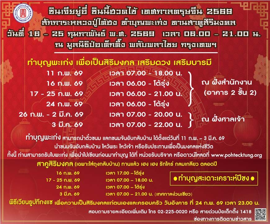 พิธีสวดชัยมงคลคาถา [พะเก่ง] มูลนิธิป่อเต็กตึ๊ง เริ่มเปิดให้สาธุชน ลงชื่อสวดชัยมงคลคาถา ตั้งแต่วันที่ 11 กุมภาพันธ์ พ.ศ. 2569 ทั้ง 2 ช่องทาง ได้แก่ 1. ที่มูลนิธิป่อเต็กตึ๊ง พลับพลาไชย และ 2.พะเก่งออนไลน์ (ผ่านทางเว็บไซต์ www.pttfny.net/cnny ) โดยท่านสามารถติดตามรายละเอียด รวมถึงรับชมพิธีรวมถึงไลฟ์พิธีสำคัญต่างๆ ตลอดช่วงเทศกาลได้ที่เฟซบุ๊ก แฟนเพจมูลนิธิป่อเต็กตึ๊ง www.facebook.com/atpohtecktung ติดต่อสอบถามข้อมูลเพิ่มเติมได้ที่ สายด่วนป่อเต็กตึ๊ง 1418