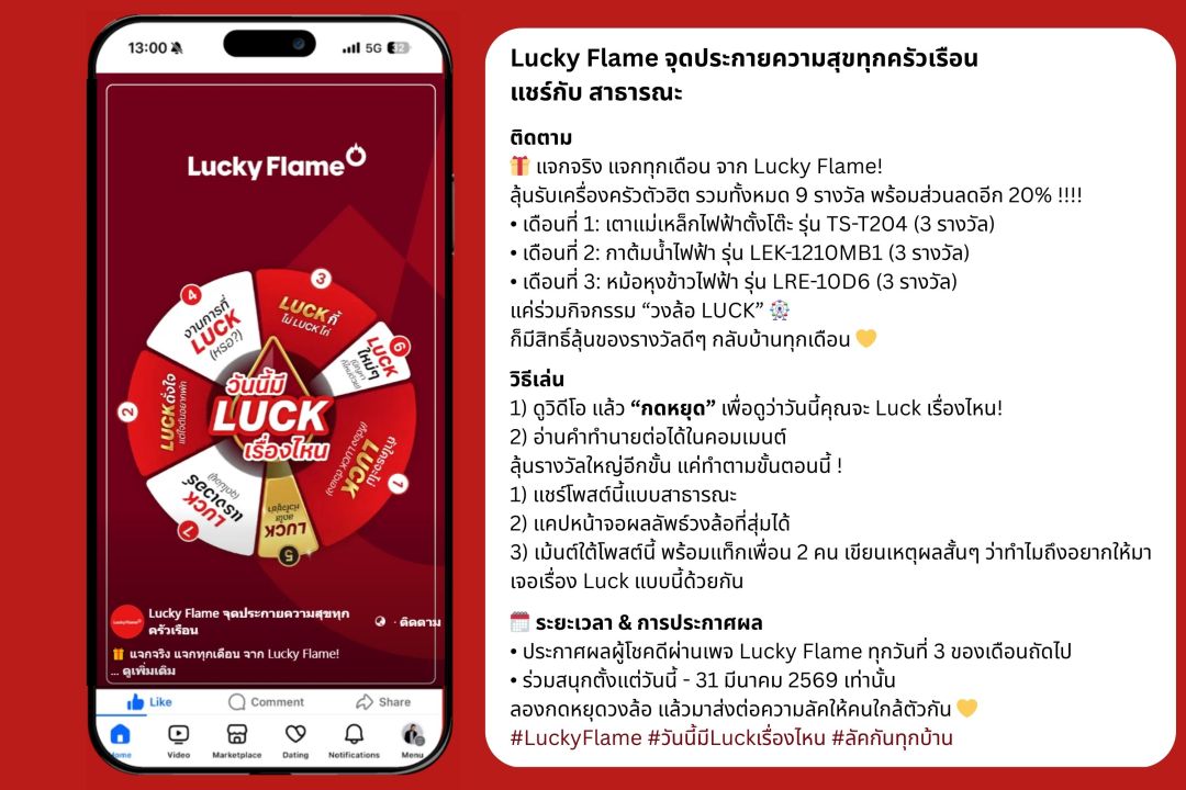 กิจกรรมในครั้งนี้เป็นอีกหนึ่งกิจกรรม ภายใต้แคมเปญเฉลิมฉลอง “50 ปี Lucky Flame ส่งต่อ ‘ลัค’ ให้กัน” ตอกย้ำการรีแบรนด์ Lucky Flame ให้เข้าถึงง่าย ทันสมัย และมีความหมาย สำหรับผู้บริโภครุ่นใหม่ แต่ยังคงคุณภาพ ความปลอดภัย และความน่าเชื่อถือ ที่ Lucky Flame สั่งสมมาอย่างยาวนานกว่า 50 ปี ในฐานะแบรนด์คู่ครัวของคนไทย