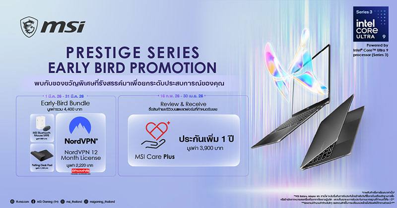 พร้อมกันนี้ ยังมีโปรโมชั่น Early Bird ที่จะเริ่มขึ้นวันที่ 1 มี.ค. 2569 ถึงวันที่ 31 มี.ค. 2569 สำหรับผู้ที่สั่งจองในระยะเวลาแคมเปญจะได้รับ NordVPN เป็นระยะเวลา 1 ปี และเมื่อรีวิวบนแพลตฟอร์มที่กำหนดพร้อมรับ MSI Care Plus เพิ่มอีก 1 ปี เช่นกัน พร้อมทั้งรับของพรีเมี่ยม Felting Desk Pad และ เม้าส์ MSI Bluetooth M98