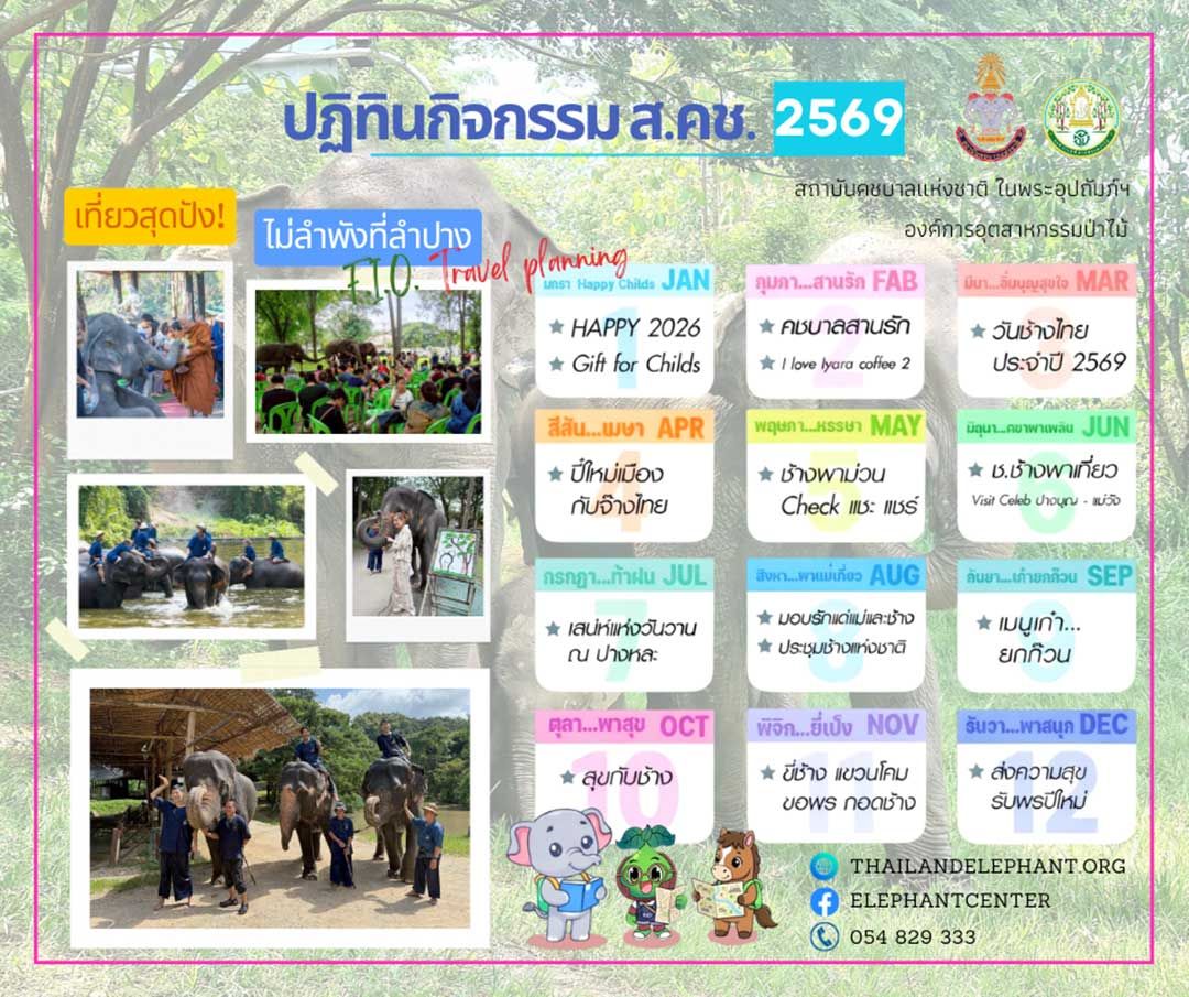 สำหรับปฏิทินกิจกรรมท่องเที่ยวตลอดปี 2569 นี้ ส.คช. ได้จัดกิจกรรมภายใต้แนวคิดที่แตกต่างกันในแต่ละเดือน เพื่อให้นักท่องเที่ยวได้รับทั้งความสนุก ความประทับใจ และความรู้เกี่ยวกับช้างไทยอย่างต่อเนื่องตลอดทั้งปี อาทิ เดือนมกราคม กิจกรรม“Happy Childs JAN” การมอบของขวัญให้เด็กๆ, เดือนกุมภาพันธ์กิจกรรม “คชบาลสานรัก สมรสเท่าเทียม” เชิญชวนคู่รักทุกคู่ ทุกเพศ ทั้งชาวไทยและชาวต่างชาติ ร่วมจดทะเบียนสมรสบนหลังช้างอย่างถูกต้องตามกฎหมายท่ามกลางบรรยากาศธรรมชาติ, เดือนมีนาคม กิจกรรม “วันช้างไทย” เฉลิมฉลองวันช้างไทย ประจำปี 2569 และเดือนเมษายน กิจกรรม “ปี๋ใหม่เมืองกับช้างไทย” สงกรานต์สุดชุ่มฉ่ำกับกิจกรรมแบบล้านนาร่วมกับช้างไทย เป็นต้น นอกจากนี้ในปี 2569 ยังมีกิจกรรมต่อเนื่องในทุกๆ เดือนตลอดทั้งปี เพื่อให้ทุกช่วงเวลาของการมาเยือนศูนย์อนุรักษ์ช้างไทย เต็มไปด้วยความหมายและความประทับใจ