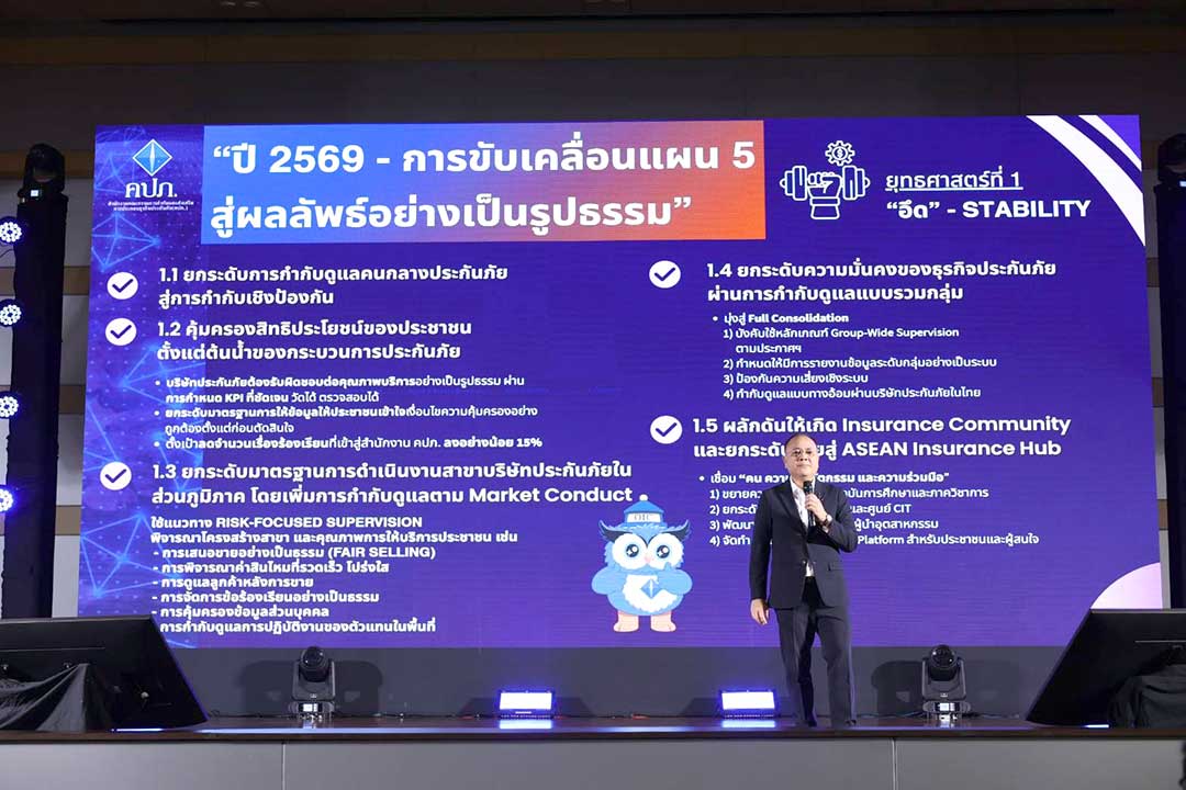 ประเด็นที่ 4 ยกระดับความมั่นคงของธุรกิจประกันภัยผ่านการกำกับดูแลแบบรวมกลุ่ม สำนักงาน คปภ. จะเดินหน้าการกำกับดูแลแบบ Group-Wide Supervision อย่างเต็มรูปแบบ โดยบังคับใช้หลักเกณฑ์และกำหนดให้กลุ่มธุรกิจประกันภัยรายงานข้อมูลระดับกลุ่มอย่างเป็นระบบ เพื่อให้สามารถมองเห็น “ความเสี่ยงที่แท้จริง” ของทั้งกลุ่มธุรกิจ และป้องกันความเสี่ยงเชิงระบบที่อาจเกิดขึ้นแบบลูกโซ่ (Domino Effect) อันจะช่วยเสริมสร้างเสถียรภาพและความมั่นคงของบริษัทประกันภัยให้สอดคล้องกับมาตรฐานสากล และสร้างความเชื่อมั่นให้ประชาชนมั่นใจว่า บริษัทประกันภัยมีฐานะการเงินที่มั่นคงและสามารถ จ่ายค่าสินไหมทดแทนได้อย่างต่อเนื่อง