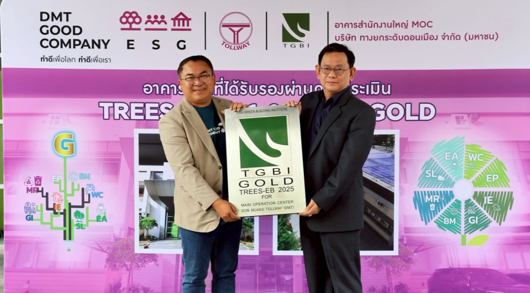 เมื่อเร็วๆนี้ ดร.ศักดิ์ดา พรรณไวย (ซ้าย) กรรมการผู้จัดการ บมจ.ทางยกระดับดอนเมือง (DMT) ได้รับป้ายสัญลักษณ์ TGBI และประกาศนียบัตรรับรองอาคารสำนักงานใหญ่ DMT ผ่านมาตรฐานเกณฑ์การประเมินความยั่งยืนทางพลังงานและสิ่งแวดล้อมไทย สำหรับอาคารระหว่างใช้งาน TREES – EB ในระดับ Gold โดยมี ศ.ดร.อรรจน์ เศรษฐบุตร (ขวา)ประธานสถาบันอาคารเขียวไทยเป็นผู้มอบ โดยอาคารสนงญ.แห่งนี้ นับเป็นอาคารเก่าแห่งแรกที่ได้รับการปรับปรุงและพัฒนา ควบคู่กับการดูแลสิ่งแวดล้อมจนได้รับการรับรอง สะท้อนว่าความยั่งยืนไม่จำเป็นต้องเริ่มจากการสร้างใหม่เสมอไป ณ อาคารสำนักงานใหญ่ บริษัทฯ