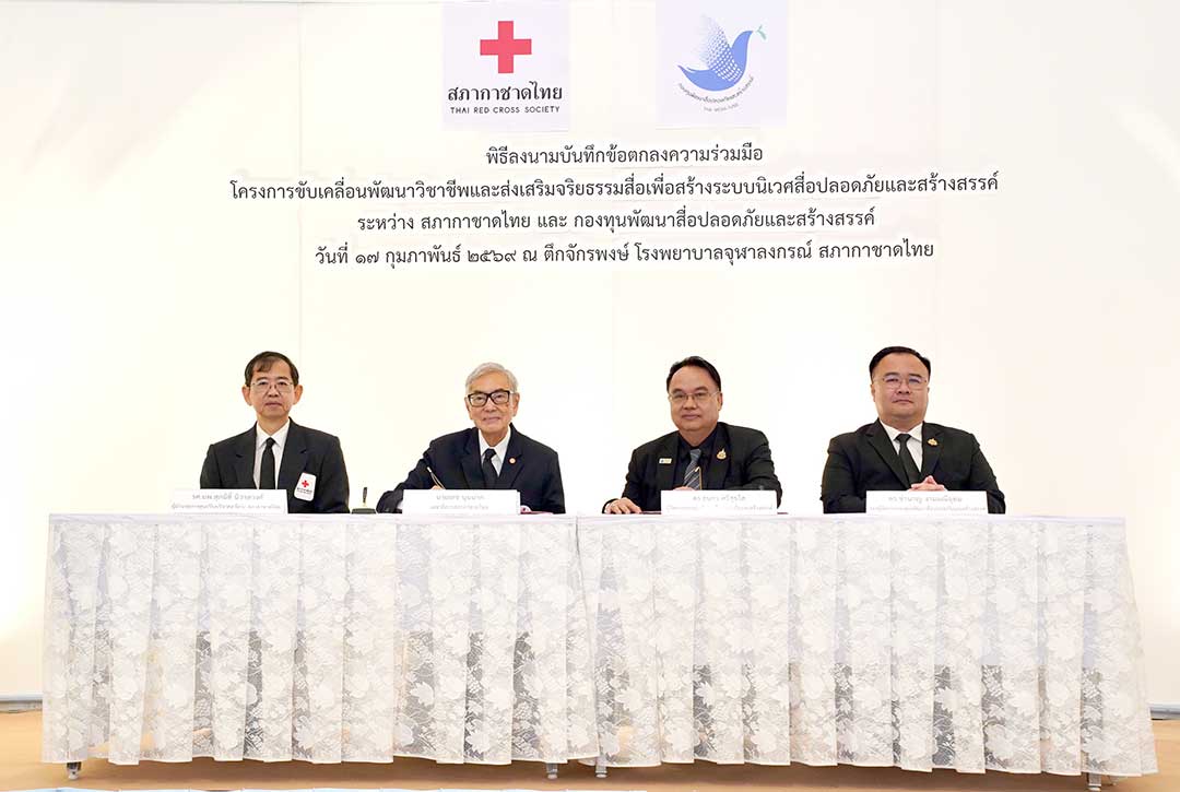 (17 ก.พ. 69) กองทุนพัฒนาสื่อปลอดภัยและสร้างสรรค์ ลงนามบันทึกข้อตกลงความร่วมมือ (MOU) โครงการขับเคลื่อนพัฒนาวิชาชีพและส่งเสริมจริยธรรมสื่อ เพื่อสร้างระบบนิเวศสื่อปลอดภัยและสร้างสรรค์ ร่วมกับ สภากาชาดไทย โดยมีนายธนกร ศรีสุขใส ผู้จัดการกองทุนพัฒนาสื่อปลอดภัยและสร้างสรรค์ นายเตช บุนนาค เลขาธิการสภากาชาดไทย นายชำนาญ งามมณีอุดม รองผู้จัดการกองทุนพัฒนาสื่อปลอดภัยและสร้างสรรค์ รศ.นพ.สุภนิติ์ นิวาตวงศ์ ผู้อำนวยการศูนย์รับบริจาคอวัยวะ สภากาชาดไทย ผู้บริหารและบุคลากรร่วมเป็นสักขีพยาน ณ ตึกจักรพงษ์ โรงพยาบาลจุฬาลงกรณ์ สภากาชาดไทย