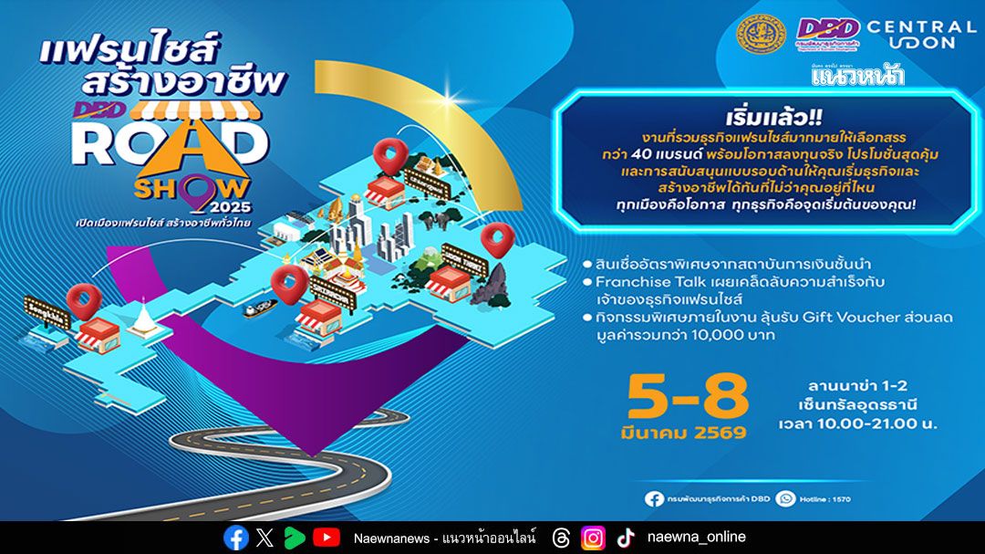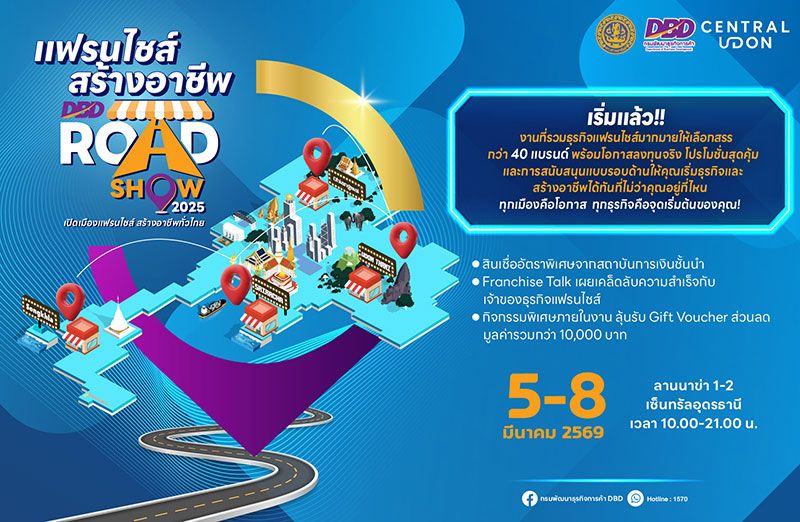 พลาดไม่ได้ 40 แบรนด์แฟรนไชส์ดังบุกอุดรธานี 5-8 มี.ค. นี้ เริ่มธุรกิจเป็นเจ้านายตัวเอง ราคาพิเศษเฉพาะงาน” กรมพัฒนาธุรกิจการค้า จัด “แฟรนไชส์สร้างอาชีพ Roadshow” ครั้งที่ 3 ฟรี! เปิดโอกาสคนอีสานมีอาชีพมั่นคง กระตุ้นเศรษฐกิจฐานรากเต็มสูบ