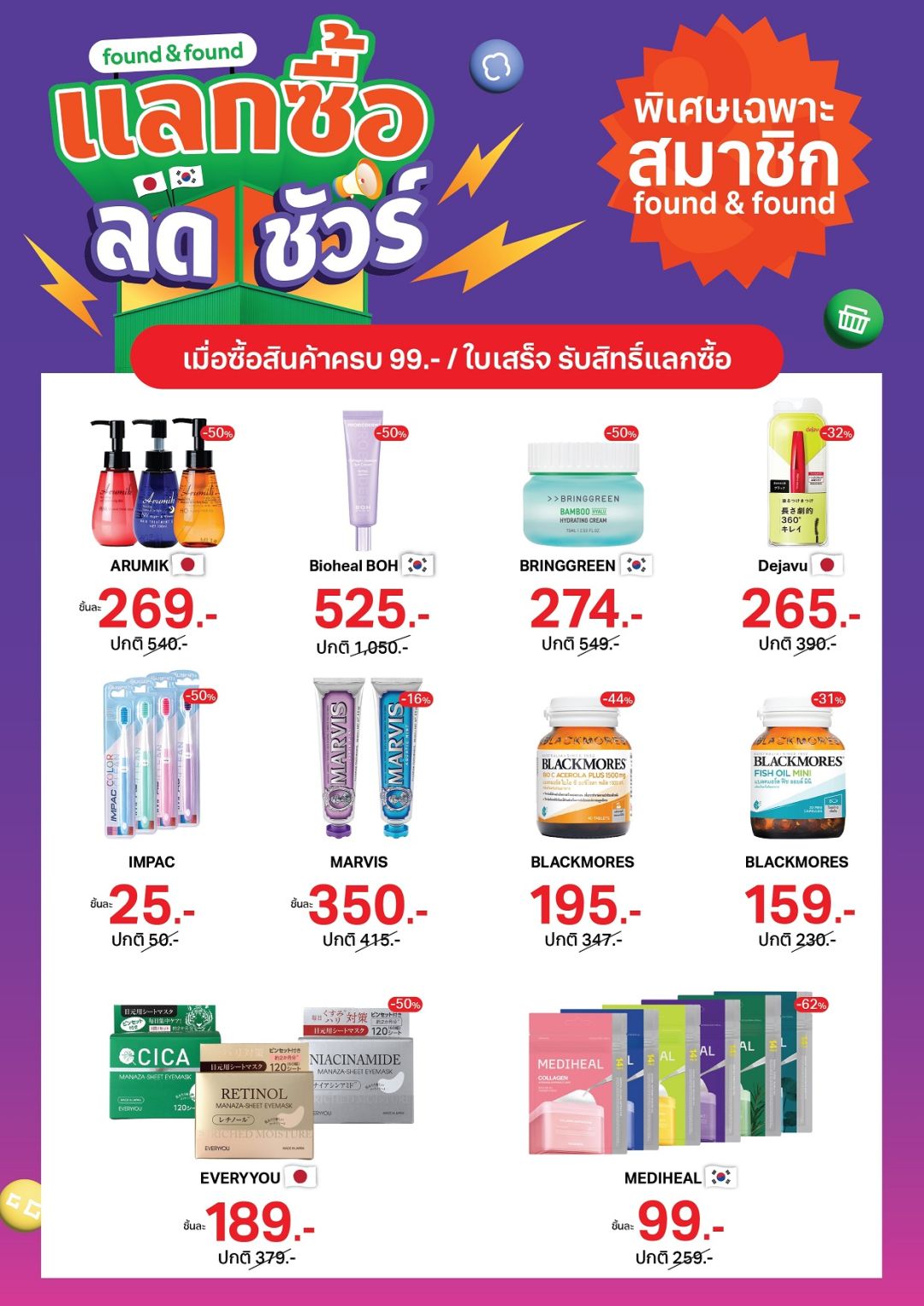 พิเศษสุด ยิ่งช้อปยิ่งคุ้ม เพียงซื้อสินค้าครบ 99 บาท รับสิทธิ์ “แลกซื้อ ลดชัวร์” กับสินค้าแบรนด์ดังที่นำมาให้เลือกช้อปกันแบบจุใจ ลดสูงสุดถึง 62% ตั้งแต่วันนี้ - 31 มีนาคม 2569 และสำหรับยอดซื้อสินค้าครบ 1,290 บาท ขึ้นไป รับ COOL SUMMER BAG มูลค่า 360 บาท ฟรี 1 ใบ เริ่ม 16 มีนาคม– 30 เมษายน 2569 ดีลนี้เฉพาะสำหรับลูกค้าที่เป็นสมาชิก found & found เท่านั้นละแบรนด์อื่น ๆ อีกมากมายกว่า 1