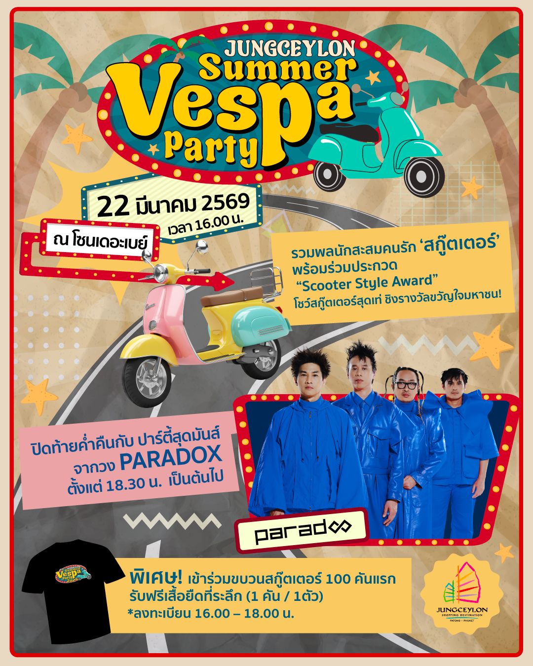 ศูนย์การค้าจังซีลอน ป่าตอง ภูเก็ต เตรียมเรียกรวมพลคนรักนักสะสมเวสป้าครั้งยิ่งใหญ่ในจังหวัดภูเก็ตในงาน “Jungceylon Summer Vespa Party” การรวมตัวของคอมมูนิตี้เวสป้า กลุ่มคนที่มีไลฟ์สไตล์และชื่นชอบความสนุกสนานเดียวกันมาร่วมปาร์ตี้กันในซัมเมอร์นี้ พร้อมเติมไอคอนิคแห่งสีสัน ความสนุก และความอิสระไปพร้อมกัน พิเศษ! ผู้เข้าร่วมงาน 100 คันแรก! รับฟรี “เสื้อยืดคอลเลกชันพิเศษจากจังซีลอน” (จำกัด 1 คัน / 1 ตัว เท่านั้น **เริ่มลงทะเบียนตั้งแต่เวลา 16.00 - 18.00 น.) แล้วมาเฟ้นหาขวัญใจมหาชนคนรักเวสป้าไปพร้อมกัน กับกิจกรรม “Scooter Style Award” ลุ้นรับของรางวัลพิเศษ จากศูนย์การค้าจังซีลอน ปิดท้ายกับมินิคอนเสิร์ตจากวงดนตรีอัลเทอร์เนทีฟร็อกชื่อดัง ขวัญใจวัยรุ่นยุค 90 กับศิลปินวง “PARADOX”
