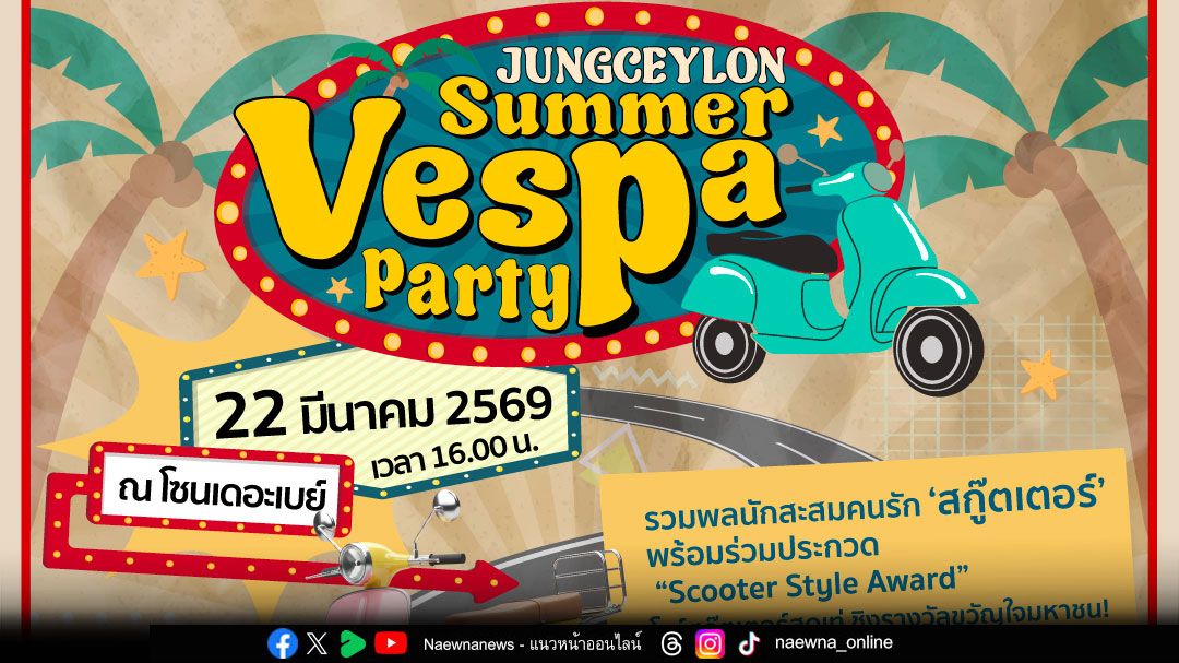 ขอเชิญชวนเหล่านักสะสม สตาร์ทรถให้พร้อมแล้วมาจอยกัน ในงาน “Jungceylon Summer Vespa Party” ที่จะจัดขึ้นในวันอาทิตย์ที่ 22 มี.ค. 69 ตั้งแต่เวลา 16.00 น.เป็นต้นไป ณ ลานกิจกรรมเดอะเบย์ อารีน่า ศูนย์การค้าจังซีลอน ป่าตอง ภูเก็ต สามารถติดตามรายละเอียดได้ที่ Jungceylon Fanpage หรือสอบถามข้อมูลเพิ่มเติมโทร. 076-600-111