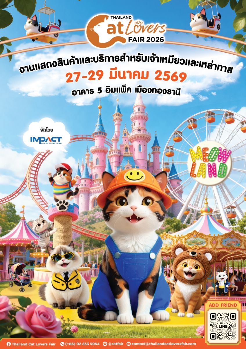 ทาสแมววอร์มร่างกายให้พร้อม เตรียมพุ่งตัวไปงานสุดยิ่งใหญ่แห่งปี Thailand Cat Lovers Fair 2026 มหกรรมสินค้าและบริการสำหรับเจ้าเหมียวและเหล่าทาส กับการเนรมิตพื้นที่กว่า 5,000 ตารางเมตรให้กลายเป็น “MEOW LAND” สวนสนุกของเหล่าเมี๊ยว! ชมแมวสีกลีบบัวครั้งแรกในประเทศไทย ร่วมเฟ้นหาแมวดาวเด่น วิธีอ่านใจแมว รู้ใจน้อง พร้อมเรียนรู้ภาษากายและเสียงร้องแบบต่างๆ ว่าแมวอยากสื่อสารอะไรกับเรา กระทบไหล่แมวอินฟูดัง ช้อปสินค้าและบริการกว่า 150 บูธ ตั้งแต่วันศุกร์ที่ 27 มีนาคม – วันอาทิตย์ที่ 29 มีนาคม 2569 ณ อาคาร 5 ศูนย์แสดงสินค้าและ การประชุม อิมแพ็ค เมืองทองธานี ตั้งแต่เวลา 10.00 – 20.00 น. บัตรเข้าชมเพียง 20 บาทเท่านั้น!