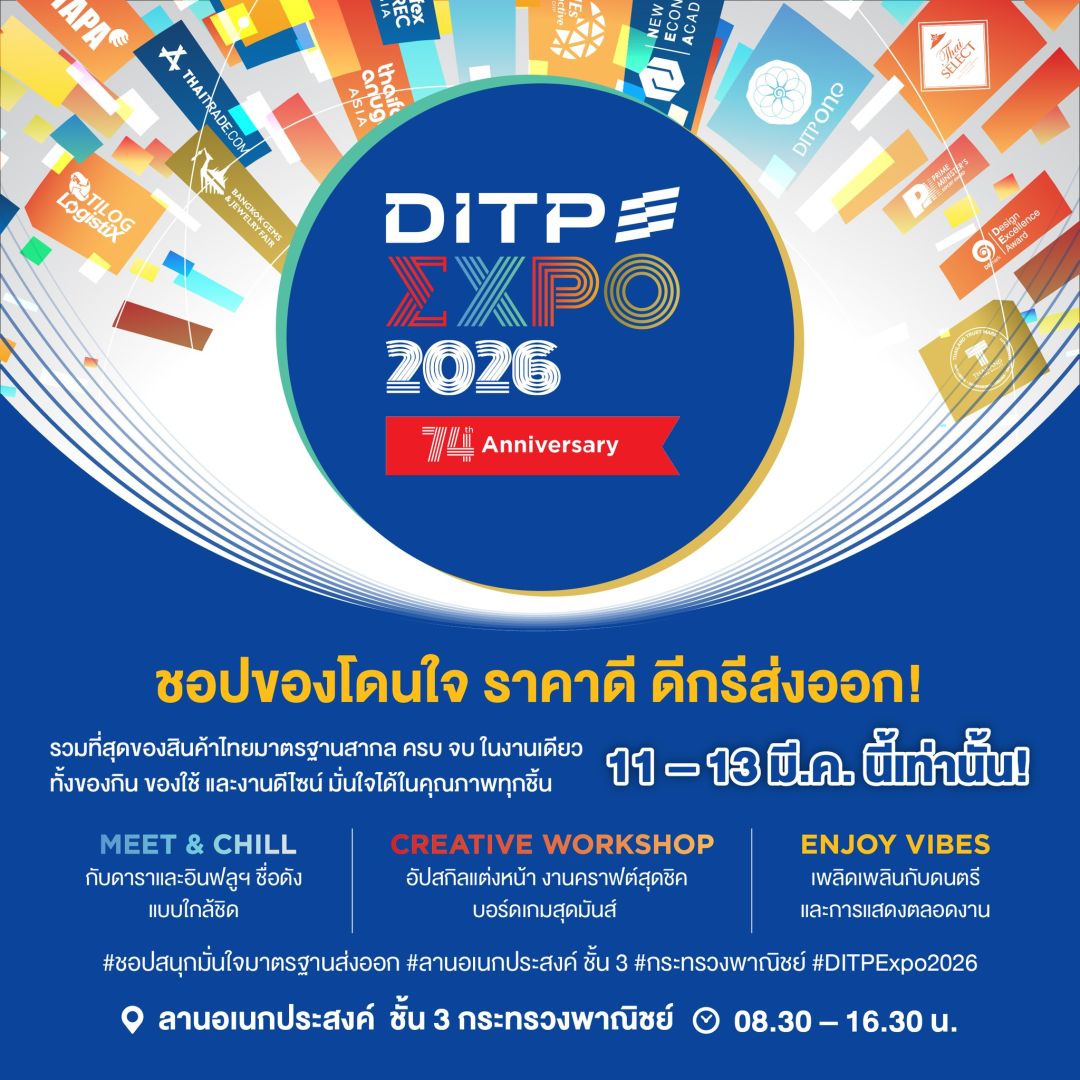 “DITP EXPO 2026 จึงเป็นเวทีสำคัญที่ผู้ประกอบการไม่ควรพลาด เพราะต่อยอดจากแนวคิดการสนับสนุนผู้ประกอบการของ DITP อย่างเป็นระบบ เริ่มจากการวางกลยุทธ์ “ภาพลักษณ์ไทยแบบร่วมสมัย” ภายใต้แนวคิด Thai to Global: From local value to global vision เพื่อส่งเสริมผู้ประกอบการที่ใช้ความคิดสร้างสรรค์และนวัตกรรมในการยกระดับสินค้าและบริการไทย ควบคู่กับการ “ติดอาวุธความรู้” ผ่านการอบรม สัมมนา และการเรียนออนไลน์ (E-Academy) รวมถึงโครงการพัฒนาผู้ส่งออกรุ่นใหม่อย่าง YELG จากนั้นคือการเปิด “พื้นที่โชว์เคส” ให้ผู้ประกอบการนำเสนอศักยภาพผ่านแพลตฟอร์ม Thaitrade.com ซึ่งเป็นตลาดกลาง B2B อย่างเป็นทางการของไทย และปิดท้ายด้วยการเชื่อมโอกาสทางการค้าในต่างประเทศ โดยยกระดับการรับรู้สินค้าและบริการไทยในตลาดโลกผ่านมาตรฐานและตราสัญลักษณ์ต่าง ๆ อาทิ PM’s Export Award, T Mark, DEmark และ Thai SELECT เพื่อเสริมความน่าเชื่อถือและเพิ่มโอกาสในการเจรจาการค้าในเวทีสากลอย่างเป็นรูปธรรม” นางสาวสุนันทา กล่าวทิ้งท้ายผู้สนใจสามารถติดตามรายละเอียดงานเพิ่มเติม และการสนับสนุนจาก DITP ได้ที่เว็บไซต์ www.ditp.go.th, Facebook: กรมส่งเสริมการค้าระหว่างประเทศ, LINE Official: @DITP หรือโทร. 1169