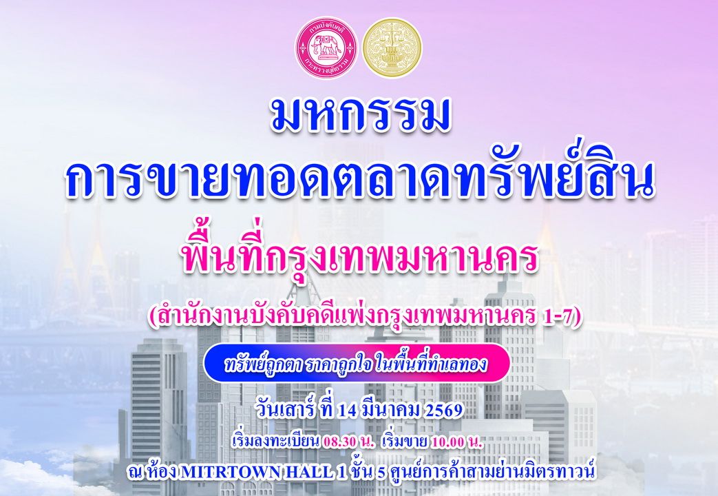 กรมบังคับคดีกำหนดจัดมหกรรมขายทอดตลาดทรัพย์สิน ประจำปีงบประมาณ พ.ศ. 2569 ในพื้นที่กรุงเทพมหานคร โดยสำนักงานบังคับคดีแพ่งกรุงเทพมหานคร 1 – 7 ทรัพย์ถูกตา ราคาถูกใจ ในพื้นที่ทำเลทอง ซึ่งจะจัดขึ้น ณ ห้องมิตรทาวน์ฮอลล์ 1 ชั้น 5 ศูนย์การค้าสามย่านมิตรทาวน์ วันเสาร์ที่ 14 มีนาคม 2569