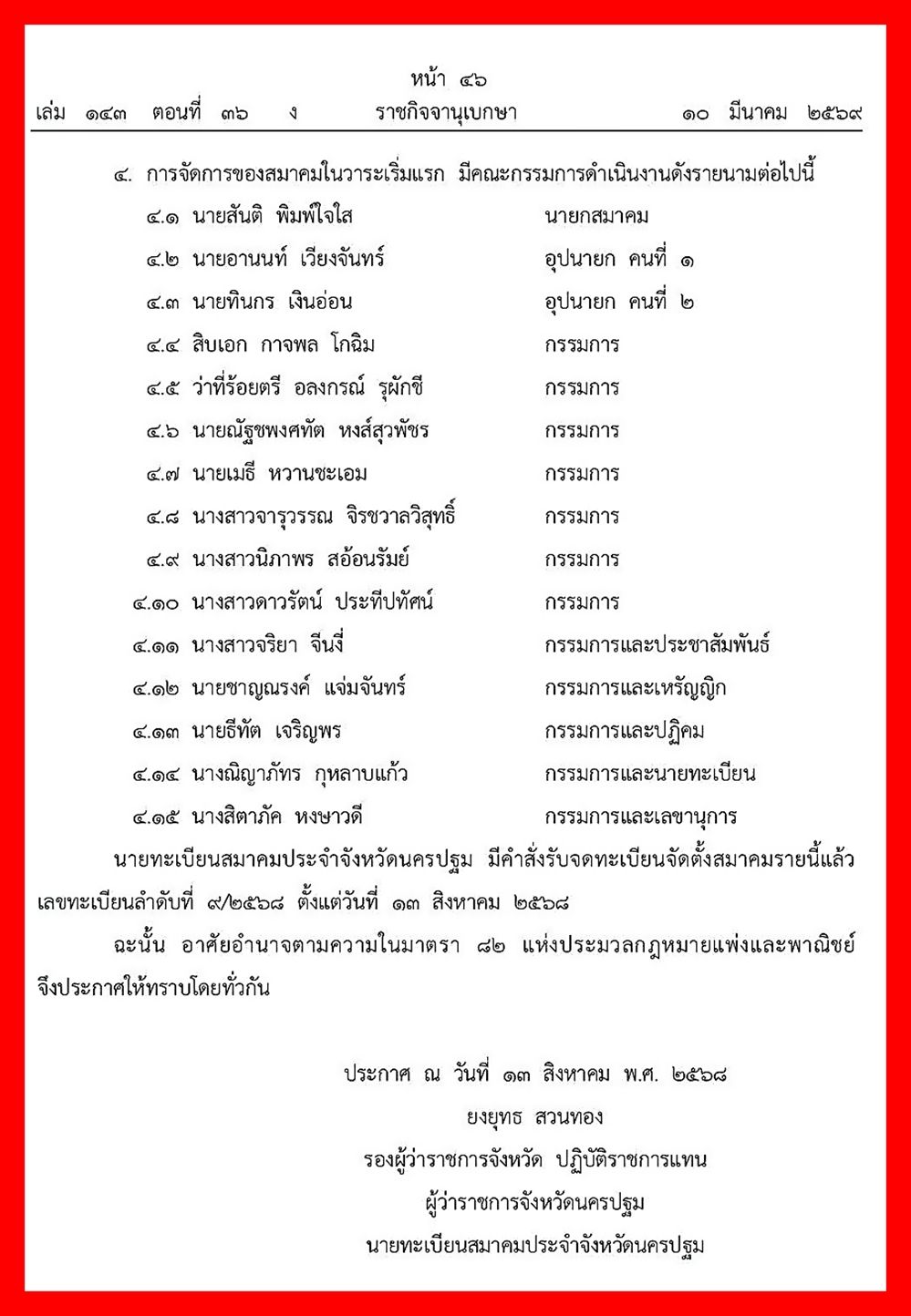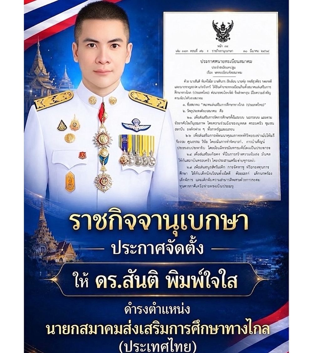เมื่อวันที่ 10 มีนาคม 2569 ราชกิจจานุเบกษา ได้เผยแพร่ประกาศนายทะเบียนสมาคม จังหวัดนครปฐม เรื่องประกาศจัดตั้ง “สมาคมส่งเสริมการศึกษาทางไกล(ประเทศไทย) ” ลงวันที่ 10 สิงหาคม 2568 โดยมี นายยงยุทธ สวนทอง รองผู้ว่าราชการจังหวัด ปฏิบัติราชการแทนผู้ว่าราชการจังหวัดนครปฐม คนล่าสุด เซ็นลงนามรับรอง โดยมีชื่อ “ดร.สันติ พิมพ์ใจใส”เตรียมขึ้นเป็นนายกสมาคมส่งเสริมการศึกษาฯ พร้อมคณะกรรมการบริหารชุดใหม่