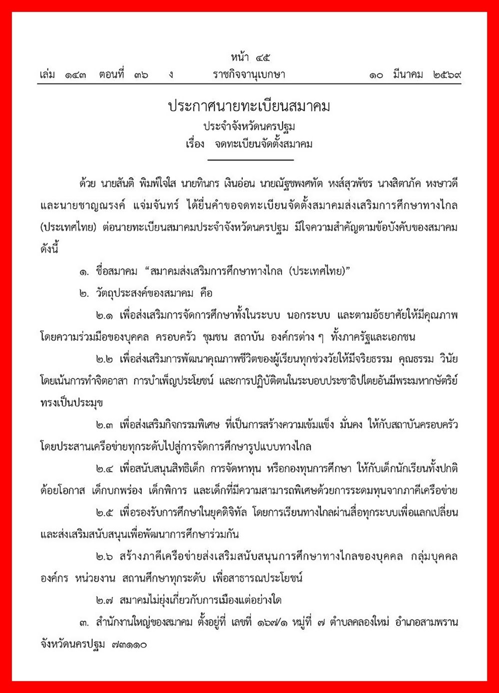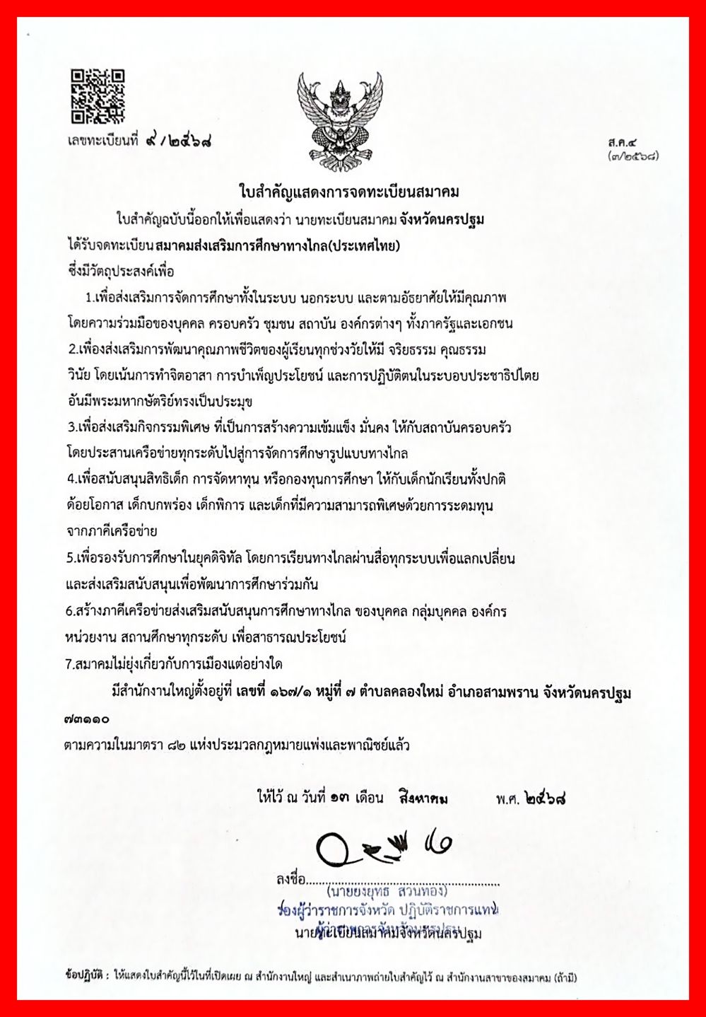 ทั้งนี้ สมาคมส่งเสริมการศึกษาทางไกล (ประเทศไทย)"วัตถุประสงค์ของสมาคม คือ เพื่อส่งเสริมการจัดการศึกษาทั้งในระบบ นอกระบบ และตามอัธยาศัยให้มีคุณภาพ โดยความร่วมมือของบุคคล ครอบครัว ชุมชน สถาบัน องค์กรต่าง ๆ ทั้งภาครัฐและเอกชน /เพื่อส่งเสริมการพัฒนาคุณภาพชีวิตของผู้เรียนทุกช่วงวัยให้มีจริยธรรม คุณธรรม วินัย โดยเน้นการทำจิตอาสา การบำเพ็ญประโยชน์ และการปฏิบัติตนในระบอบประชาธิปไตยอันมีพระมหากษัตริย์ทรงเป็นประมุข/เพื่อส่งเสริมกิจกรรมพิเศษ ที่เป็นการสร้างความเข้มแข็ง มั่นคง ให้กับสถาบันครอบครัว พร้อมทั้งประสานเครือข่ายทุกระดับไปสู่การจัดการศึกษารูปแบบทางไกล/เพื่อสนับสนุนสิทธิเด็ก การจัดหาทุน หรือกองทุนการศึกษา ให้กับเด็กนักเรียนทั้งปกติ ด้อยโอกาส เด็กบกพร่อง เด็กพิการ และเด็กที่มีความสามารถพิเศษด้วยการระดมทุนจากภาษีเครือข่าย/เพื่อรองรับการศึกษาในยุคดิจิทัล โดยการเรียนทางไกลผ่านสื่อทุกระบบเพื่อแลกเปลี่ยน และส่งเสริมสนับสนุนเพื่อพัฒนาการศึกษาร่วมกัน /สร้างภาคีเครือข่ายส่งเสริมสนับสนุนการศึกษาทางไกลของบุคคล กลุ่มบุคคล องค์กร หน่วยงาน สถานศึกษาทุกระดับ เพื่อสาธารณประโยชน์/สมาคมไม่ยุ่งเกี่ยวกับการเมืองแต่อย่างใด/สำนักงานใหญ่ของสมาคม ตั้งอยู่ที่ เลขที่ 167 หมู่ที่ 7 ตำบลคลองใหม่ อำเภอสามพราน จังหวัดนครปฐม 73110
