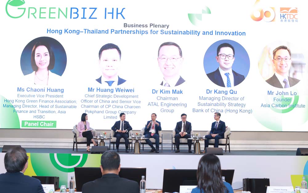 ในการประชุมใหญ่หัวข้อ “ความร่วมมือระหว่างฮ่องกง–ไทย เพื่อส่งเสริมความยั่งยืนและนวัตกรรม” ผู้นำจากภาครัฐและภาคธุรกิจของฮ่องกงและไทย ได้ร่วมกันสำรวจแนวทางความร่วมมือข้ามพรมแดนด้านการเงินสีเขียว นวัตกรรม และการพัฒนาอย่างยั่งยืน คุณเฉาหนี่ หวง รองประธานบริหาร สมาคมการเงินสีเขียวแห่งฮ่องกง (HKGFA); กรรมการผู้จัดการ หัวหน้าฝ่ายการเงินและการเปลี่ยนผ่านเพื่อความยั่งยืน ประจำภูมิภาคเอเชีย ธนาคารเอชเอสบีซี, ดร.คัง คู กรรมการผู้จัดการฝ่ายกลยุทธ์ความยั่งยืน ธนาคารแห่งประเทศจีน (ฮ่องกง) ร่วมด้วย ดร.คิม มัก ประธานบริษัท อนาล็อก โฮลดิ้งส์ จำกัด และคุณจอห์น โล ผู้ก่อตั้งสถาบันคาร์บอนแห่งเอเชีย ได้เน้นย้ำถึงจุดแข็งของฮ่องกงในฐานะศูนย์กลางการเงินสีเขียวระดับนานาชาติ และแสดงให้เห็นว่าเครื่องมือทางการเงินที่เป็นนวัตกรรมใหม่ กำลังเร่งการเปลี่ยนแปลงด้าน ESG ขององค์กรอย่างไร