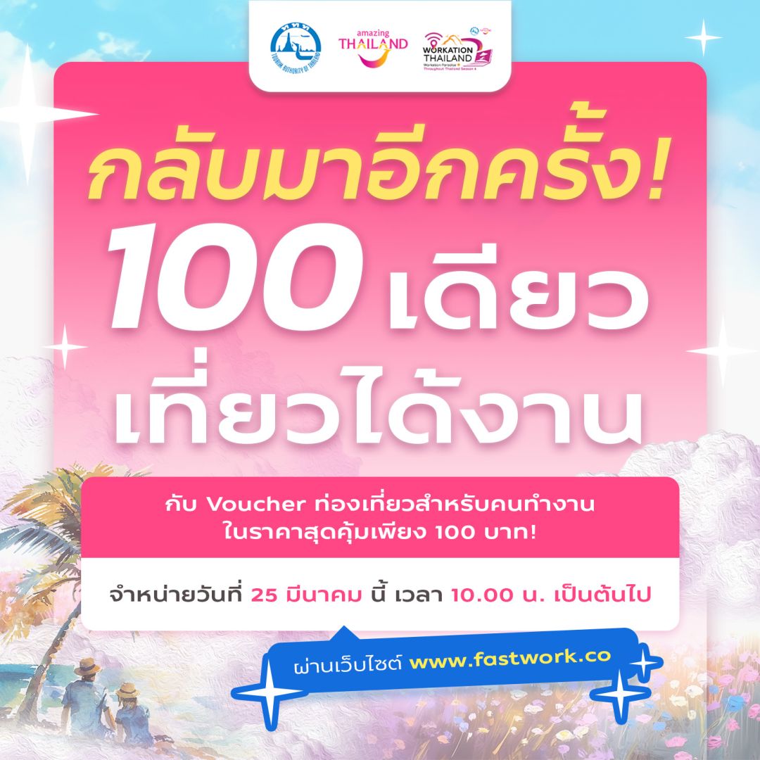 การท่องเที่ยวแห่งประเทศไทย (ททท.) ได้ดำเนินโครงการ Workation Paradise Throughout Thailand ภายใต้ Workation Thailand มาอย่างต่อเนื่อง เป็น Season ที่ 4 โดยมีกิจกรรม 100 เดียวเที่ยวได้งาน ซึ่งเป็นกิจกรรมที่นำ Voucher ด้านการท่องเที่ยว อาทิ ที่พัก ร้านอาหาร และกิจกรรมท่องเที่ยว มาจัดจำหน่ายในราคา 100 บาท เพื่อเป็นการกระตุ้นการท่องเที่ยว ทำให้เกิดการออกเดินทางจริง พร้อมทั้งมอบประสบการณ์และความคุ้มค่าให้กับนักท่องเที่ยว โดยกิจกรรมฯ จะจัดขึ้นในวันที่ 25 มีนาคม 2569 บนแพลตฟอร์ม Fastwork