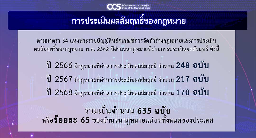 ในการนี้หน่วยงานของรัฐที่มีหน้าที่รับผิดชอบบังคับใช้กฎหมายได้ดำเนินการประเมินผลสัมฤทธิ์ของกฎหมายที่อยู่ในความรับผิดชอบตามรอบการประเมินทุกห้าปี ซึ่งเป็นหน้าที่ตามมาตรา 34 แห่งพระราชบัญญัติหลักเกณฑ์การจัดทำร่างกฎหมายและการประเมินผลสัมฤทธิ์ของกฎหมาย พ.ศ. 2562 โดยในปี 2566 มีกฎหมายที่ผ่านการประเมินผลสัมฤทธิ์จำนวน 248 ฉบับ ปี 2567 จำนวน 217 ฉบับ และปี 2568 จำนวน 170 ฉบับ (รวมเป็นจำนวน 635 ฉบับหรือร้อยละ 65 ของจำนวนกฎหมายแม่บททั้งหมดของประเทศ)