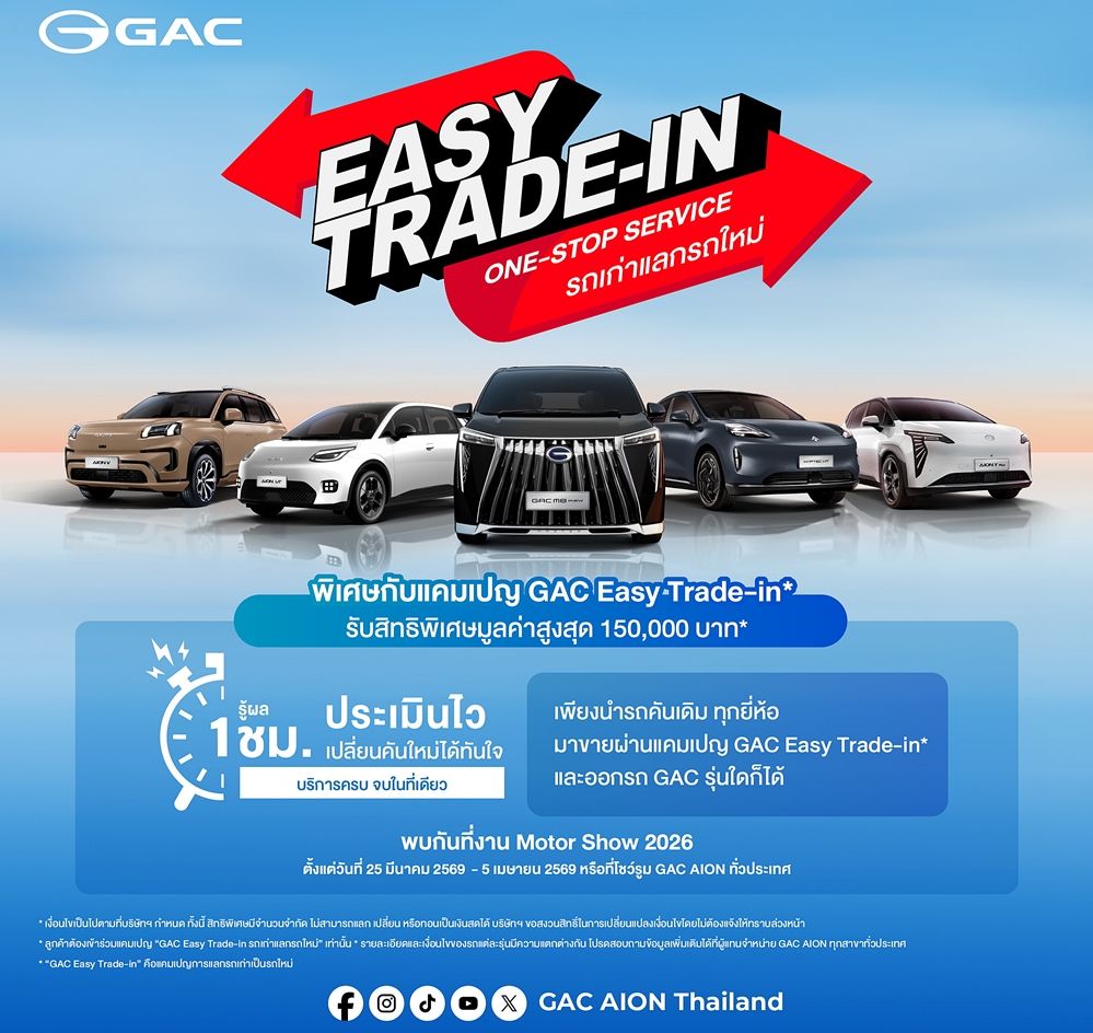 GAC AION Thailand มอบบริการแบบ One-Stop Service ทราบผลประเมินราคารถภายใน 1 ชม. และดำเนินการจบได้เร็วที่สุดภายในวันเดียว พร้อมรับส่วนลดพิเศษสูงสุด 150,000 บาท* เมื่อนำรถคันเดิมทุกยี่ห้อมาเทิร์นเพื่อออกรถ GAC รุ่นใหม่ ตั้งแต่วันที่ 25 มีนาคม 2569 – 5 เมษายน 2569