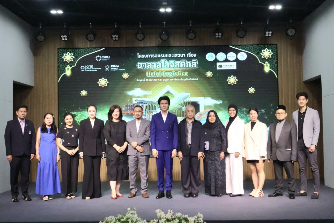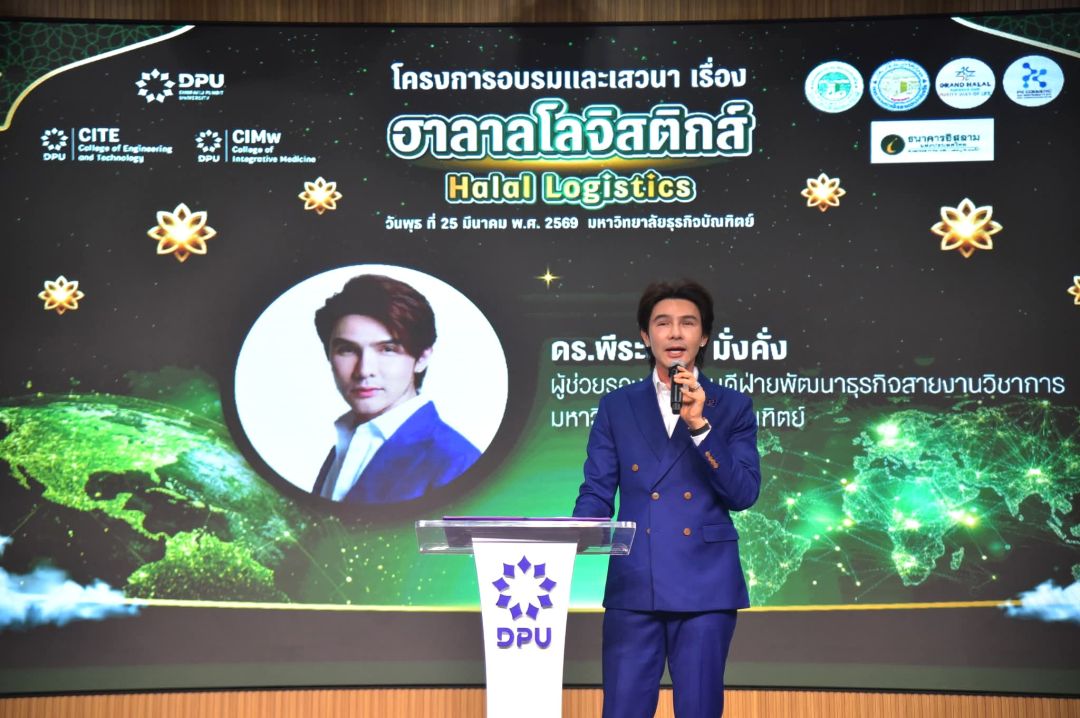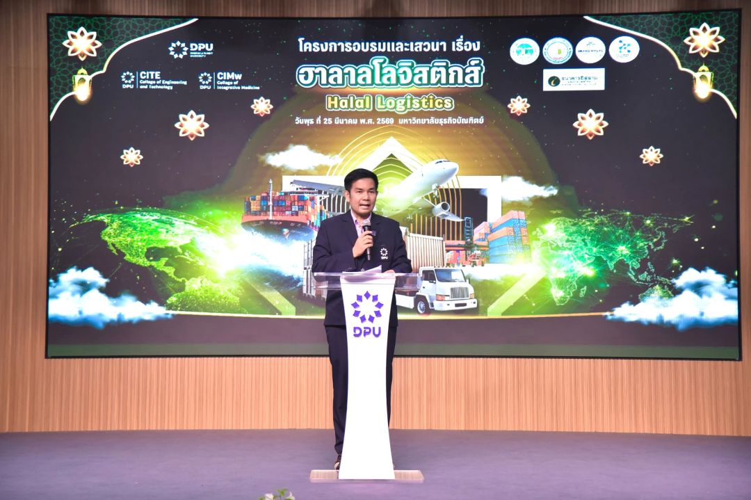 มหาวิทยาลัยธุรกิจบัณฑิตย์ (DPU) โดยวิทยาลัยวิศวกรรมศาสตร์และเทคโนโลยี (CITE) ร่วมกับ วิทยาลัยการแพทย์แบบบูรณาการ (CIMw) และสถาบันองค์ความรู้เวลเนส (WKI) จัดโครงการอบรมและเสวนา ฮาลาลโลจิสติกส์ “Halal Logistics” เพื่อยกระดับองค์ความรู้ด้านการขนส่งฮาลาลแบบครบวงจร ให้กับผู้ประกอบการและนักศึกษา โดยมุ่งพัฒนากำลังคนให้สอดคล้องกับทิศทางการเติบโตของเศรษฐกิจฮาลาลโลก โดยเฉพาะตลาดตะวันออกกลางซึ่งมีศักยภาพสูง โดยมี ดร.พีระยุทธ มั่งคั่ง ผู้ช่วยรองอธิการบดีด้านพัฒนาธุรกิจ สายงานวิชาการ ให้เกียรติเป็นประธานในการเปิด เมื่อวันที่ 25 มีนาคม 2569 ที่ผ่านมา ณ ห้องประชุมสุทธิเกตุ