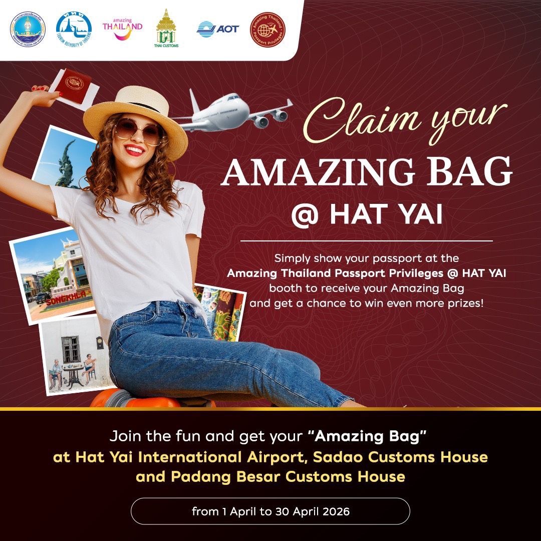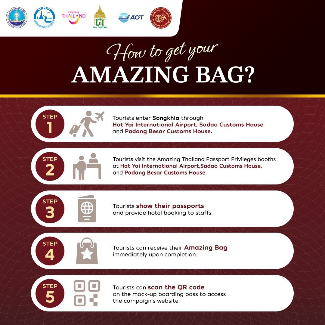 สำหรับวิธีการเข้าร่วมกิจกรรรมสำหรับวิธีการเข้าร่วมกิจกรรม นักท่องเที่ยวสามารถแสดงหนังสือเดินทาง (Passport) ณ บูทกิจกรรม ได้แก่ ท่าอากาศยานนานาชาติหาดใหญ่ ด่านศุลกากรสะเดา และด่านศุลกากรปาดังเบซาร์ ระหว่างวันที่ 1 – 30 เมษายน 2569 เพื่อรับ Amazing Bag ได้ทันที พร้อมสแกน QR Code เพื่อลงทะเบียนรับสิทธิพิเศษและส่วนลดที่ผู้สนใจสามารถดูรายละเอียดเพิ่มเติมเกี่ยวกับโครงการ