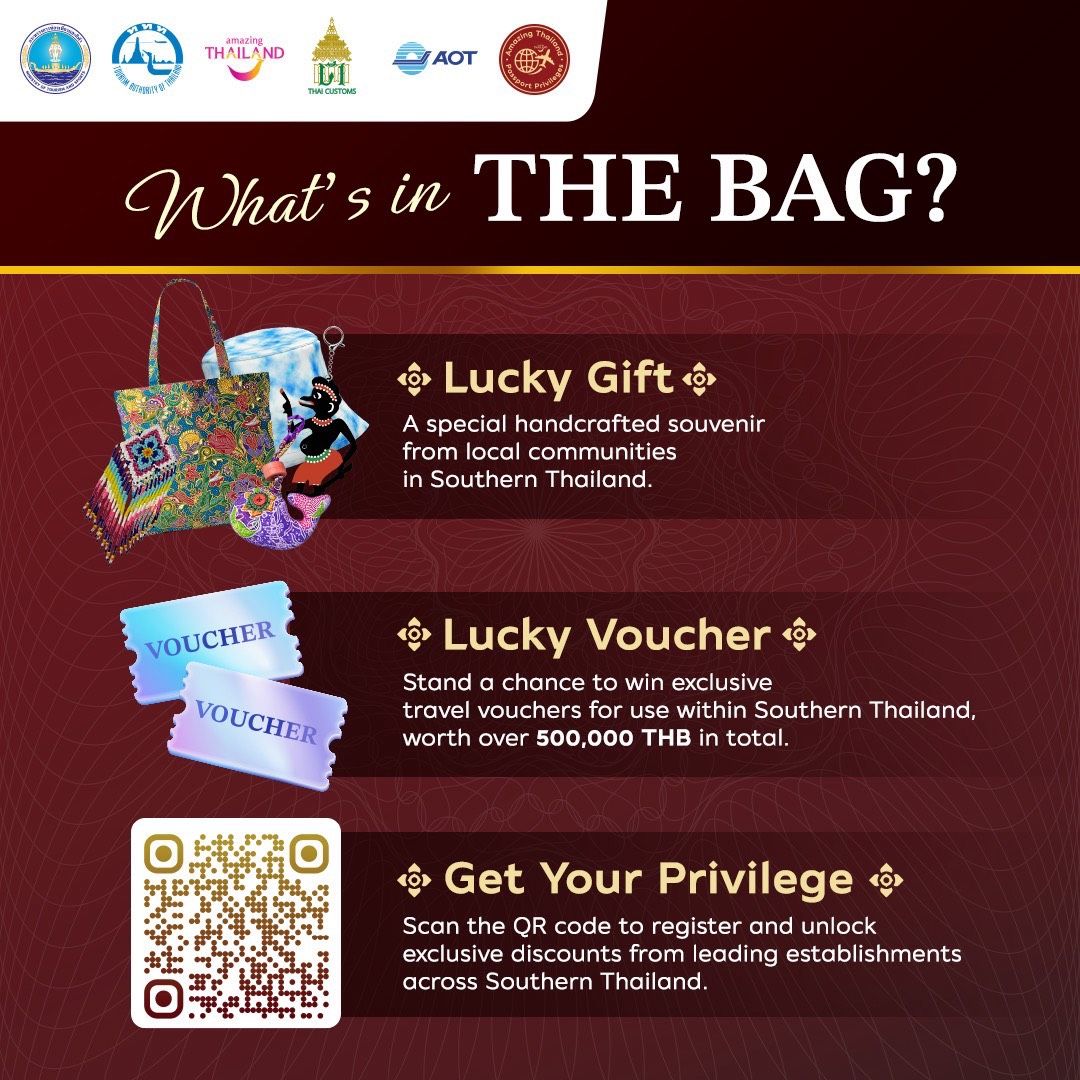 นอกจากนี้ ยังมีไฮไลต์สำคัญคือ กิจกรรม “Amazing Bag” มอบของขวัญแห่งความทรงจำที่สะท้อน “เสน่ห์ไทย” ผ่านการคัดสรรของที่ระลึก (Lucky Gift) จากชุมชนในภาคใต้ อาทิ ยาดมสมุนไพร, อภิบาลบ่อพลับ อ.เมือง จ.สงขลา ผลิตภัณฑ์จากผ้ามัดย้อม จากศูนย์การเรียนรู้ผ้ามัดย้อมบ้านหน้าฮะ (หรือกลุ่มวิสาหกิจชุมชนเชี่ยวหลานมัดย้อมมัดใจบ้านหน้าฮะ) อ.บ้านตาขุน จ.สุราษฎร์ธานี, กระเป๋าผ้าปาเต๊ะ อ.เมือง จ.นครศรีธรรมราช, หมวกผ้ามัดย้อม OTOP ผ้ามัดย้อมสไตล์กนกวรรณ จ.ตรัง, กระเป๋ากระจูด อ.ควนขนุน จ.พัทลุง, กระเป๋าใส่บัตรผ้าบาติก OTOP NURFA จ.ปัตตานี, หมวกผ้าปาเต๊ะ OTOP Pnara ปาเต๊ะ จ.นราธิวาส และ พวงกุญแจวาฬปาเต๊ะ