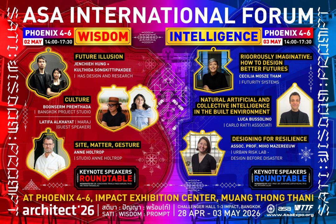 นิทรรศการ ASA ALL MEMBER - Thailand Only : สะท้อนสถาปัตยกรรมกับบริบทไทยไทย ตามด้วย ASA EMERGING YOUNG ARCHITECTS IN THE AGE OF NEW DISRUPTIONS นิทรรศการแสดงผลงานของสถาปนิกคลื่นลูกใหม่ในยุคแห่งความเปลี่ยนแปลง ชี้ให้เห็นศักยภาพ แนวคิด และบทบาทที่กําลังเปลี่ยนแปลงของนักออกแบบร่วมสมัย ในการมีส่วนกําหนดทิศทางของสังคมไทยควบคู่ไปกับบริบทระดับนานาชาติ ส่วนที่ 2 FORUM แบ่งเป็น 2 กลุ่ม คือ 1.สัมมนาระดับนานาชาติ ASA INTERNATIONAL FORUM งานสัมมนาทางสถาปัตยกรรมที่รวบรวม Keynote Speakers ระดับนานาชาติ มาร่วมนําเสนอและแลกเปลี่ยนแนวคิดที่สะท้อนความสัมพันธ์ระหว่าง “WISDOM” (ปัญญามนุษย์) และ “NEW INTELLIGENCE” (ปัญญาใหม่) ผ่านมุมมองและประสบการณ์ของสถาปนิกผู้มีชื่อเสียงระดับนานาชาติ ในหลากหลายหัวข้อน่าสนใจ ซึ่งสัมมนานี้จะจัดเพียง 2 วันระหว่างวันที่ 2 และ 3 พฤษภาคม 2569 ณ ห้องฟินิกซ์ 4-6 อาคารแสดงสินค้า อิมแพ็ค เมืองทองธานี