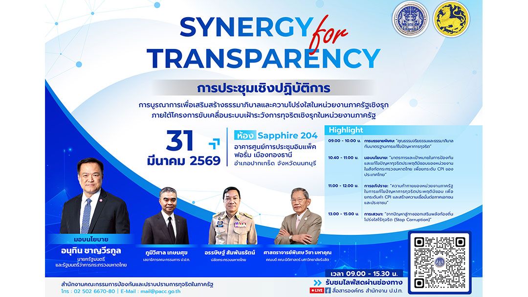 สำนักงานคณะกรรมการป้องกันและปราบปรามการทุจริตในภาครัฐ (ป.ป.ท.) เตรียมจัดการประชุมเชิงปฏิบัติการ“Synergy for Transparency : การบูรณาการเพื่อเสริมสร้างธรรมาภิบาลและความโปร่งใสในหน่วยงานภาครัฐเชิงรุก” ภายใต้โครงการขับเคลื่อนระบบเฝ้าระวังการทุจริตเชิงรุกในหน่วยงานภาครัฐ ในวันที่ 31 มีนาคม 2569 ณ ห้อง Sapphire 204 อาคาร IMPACT Forum เมืองทองธานี