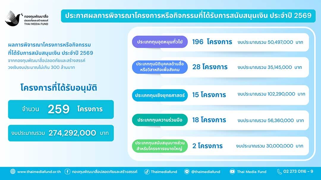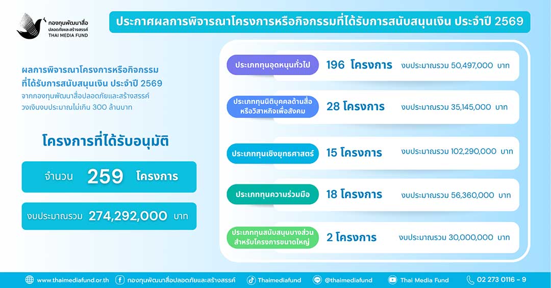 30 มีนาคม 2569 กองทุนพัฒนาสื่อปลอดภัยและสร้างสรรค์ประกาศผลการพิจารณาโครงการหรือกิจกรรมที่ได้รับการสนับสนุนเงิน ประจำปี 2569 ทางเว็บไซต์ https://www.thaimediafund.or.th/download/granting-2569/ โดยมีผลการพิจารณาโครงการหรือกิจกรรมที่ได้รับการสนับสนุน จำนวน 259 โครงการ