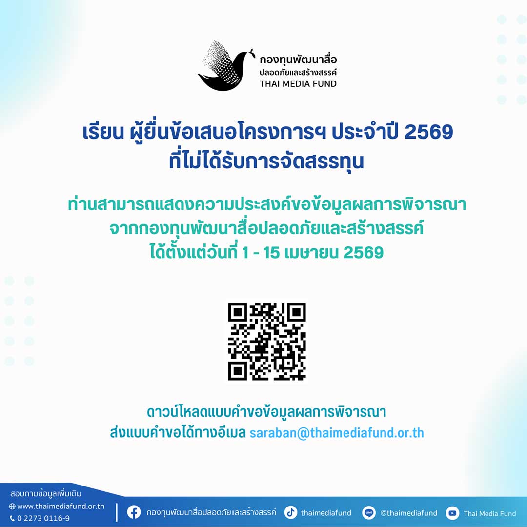 ทั้งนี้ผู้ยื่นข้อเสนอโครงการฯ ที่ไม่ได้รับการจัดสรรทุน สามารถแสดงความประสงค์ขอข้อมูลผลการพิจารณา ได้ตั้งแต่วันที่ 1-15 เมษายน 2569 โดยดาวน์โหลดแบบคำขอข้อมูลผลการพิจารณาขอรับการสนับสนุนเงินจากกองทุนพัฒนาสื่อปลอดภัยและสร้างสรรค์ ได้ที่ https://www.thaimediafund.or.th/download/tmf-grant-69/ และส่งแบบคำขอผ่านอีเมล saraban@thaimediafund.or.th