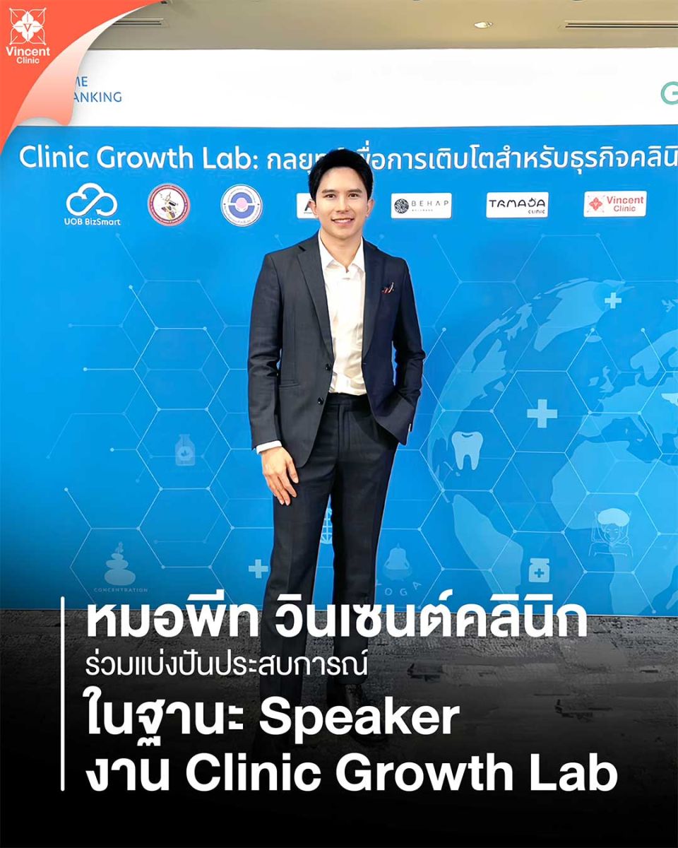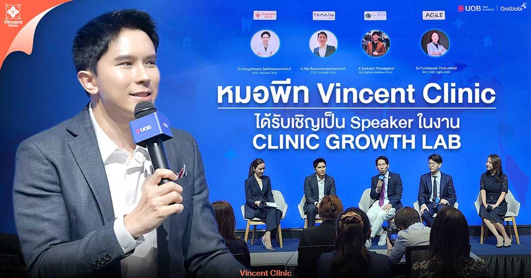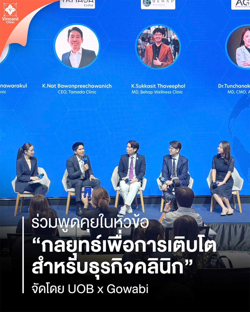 คุณหมอพีท แห่ง Vincent Clinic ขึ้นเวทีเสวนา “CLINIC GROWTH LAB” ที่จัดขึ้นโดย UOB x Gowabi เปิดพื้นที่แลกเปลี่ยนเทคนิคปั้นแบรนด์คลินิกให้เติบโตและประสบความสำเร็จ ภายใต้หัวข้อ “กลยุทธ์เพื่อการเติบโตสำหรับธุรกิจคลินิก” เพื่อร่วมกันพัฒนาศักยภาพผู้ประกอบการในอุตสาหกรรมธุรกิจคลินิกความงามให้มีคุณภาพ ณ Auditorium ชั้น 5 UOB Plaza เมื่อวันก่อน