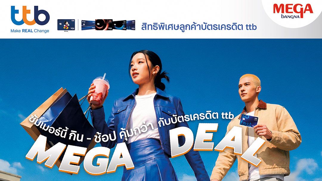 เติมความสุข จัดเต็มความคุ้มทั้งกิน - ช้อป ตลอดซัมเมอร์นี้ไปกับแคมเปญ “MEGA DEAL” ด้วยบัตรเครดิต ttb ที่เมกาบางนา ได้ตั้งแต่วันที่ 1 เมษายน 2569 – 30 มิถุนายน 2569 ศึกษารายละเอียดเพิ่มเติมของโปรโมชัน ได้ที่ https://www.ttbbank.com/th/promotion/credit-card/dining/shopping-megabangna-apr26