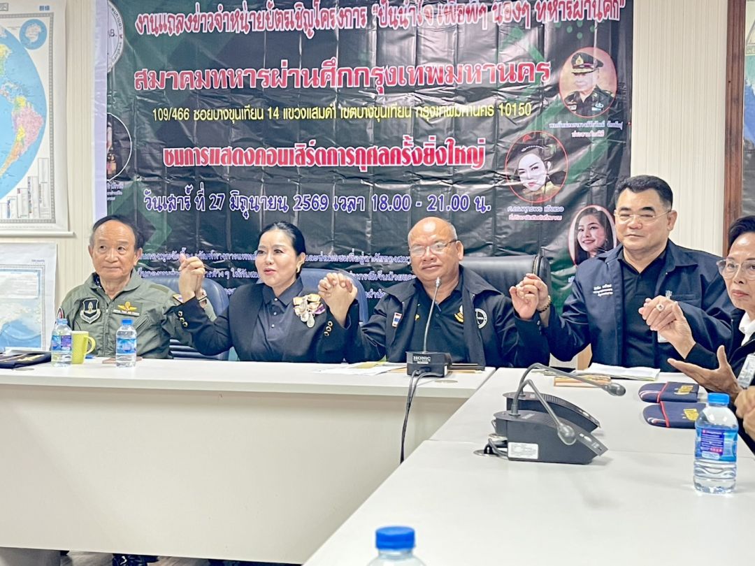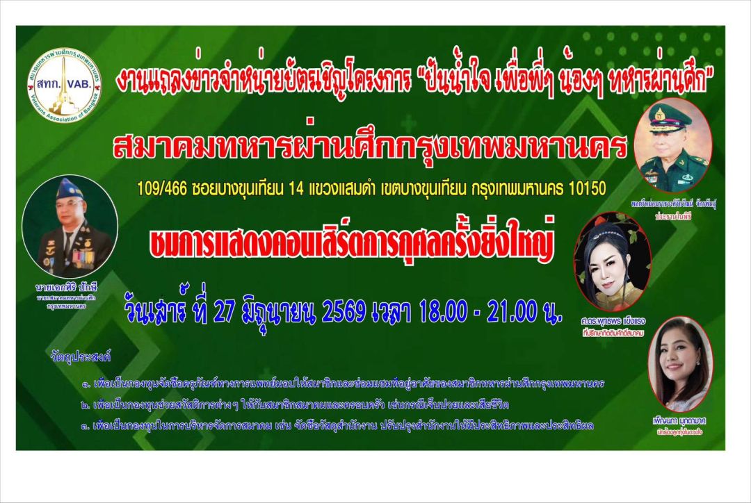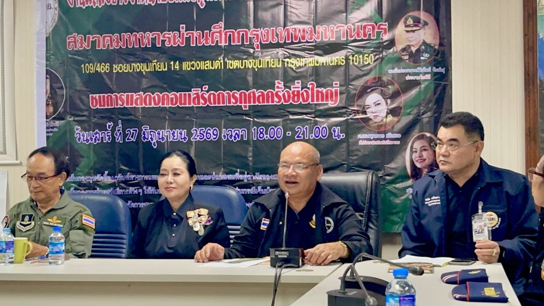 วันนี้ 20 เมษายน 2569 สมาคมทหารผ่านศึกกรุงเทพ โดยนายกเอกศิริ ปักษี พลอากาศตรี ณัฏฐอรรจน์ ถวิลหวัง ศ.ดร. พุทธพร แข็งแรง นายวรทัต เครือวรานนท์ เลขานุการ สมาคมทหารผ่านศึก และ นายธนวัฒน์ ลือเนตร (บก.ตุ่น อินเตอร์ ที่ปรึกษาสมาคมทหารผ่านศึกแห่งประเทศไทย) แถลงข่าวการจัดงานคอนเสิร์ตการกุศล เพื่อระดมทุนสนับสนุนสวัสดิการให้กับพี่น้องทหารผ่านศึก ผู้พิการ และครอบครัวทหารผ่านศึกที่ต้องการความช่วยเหลือ