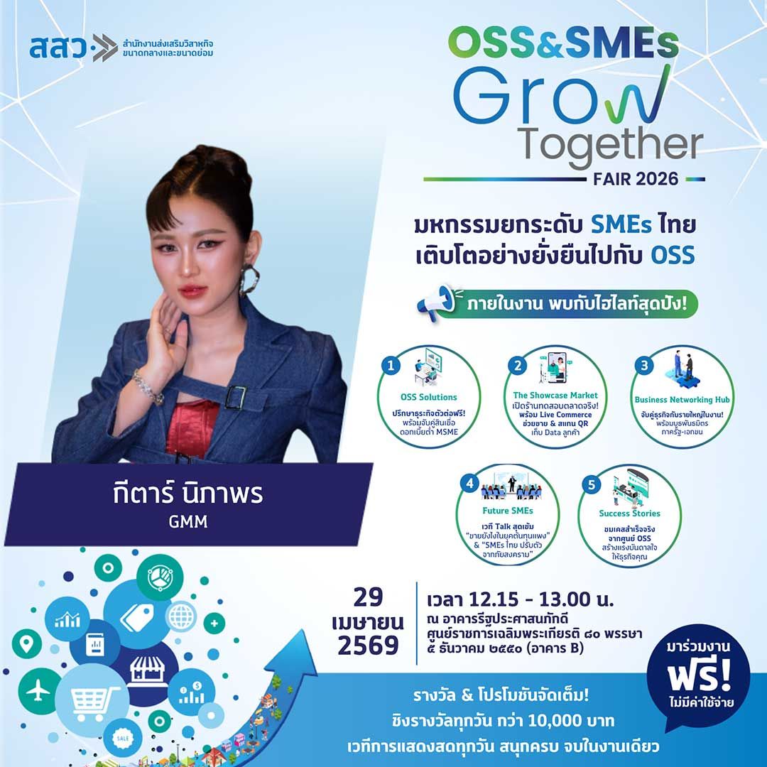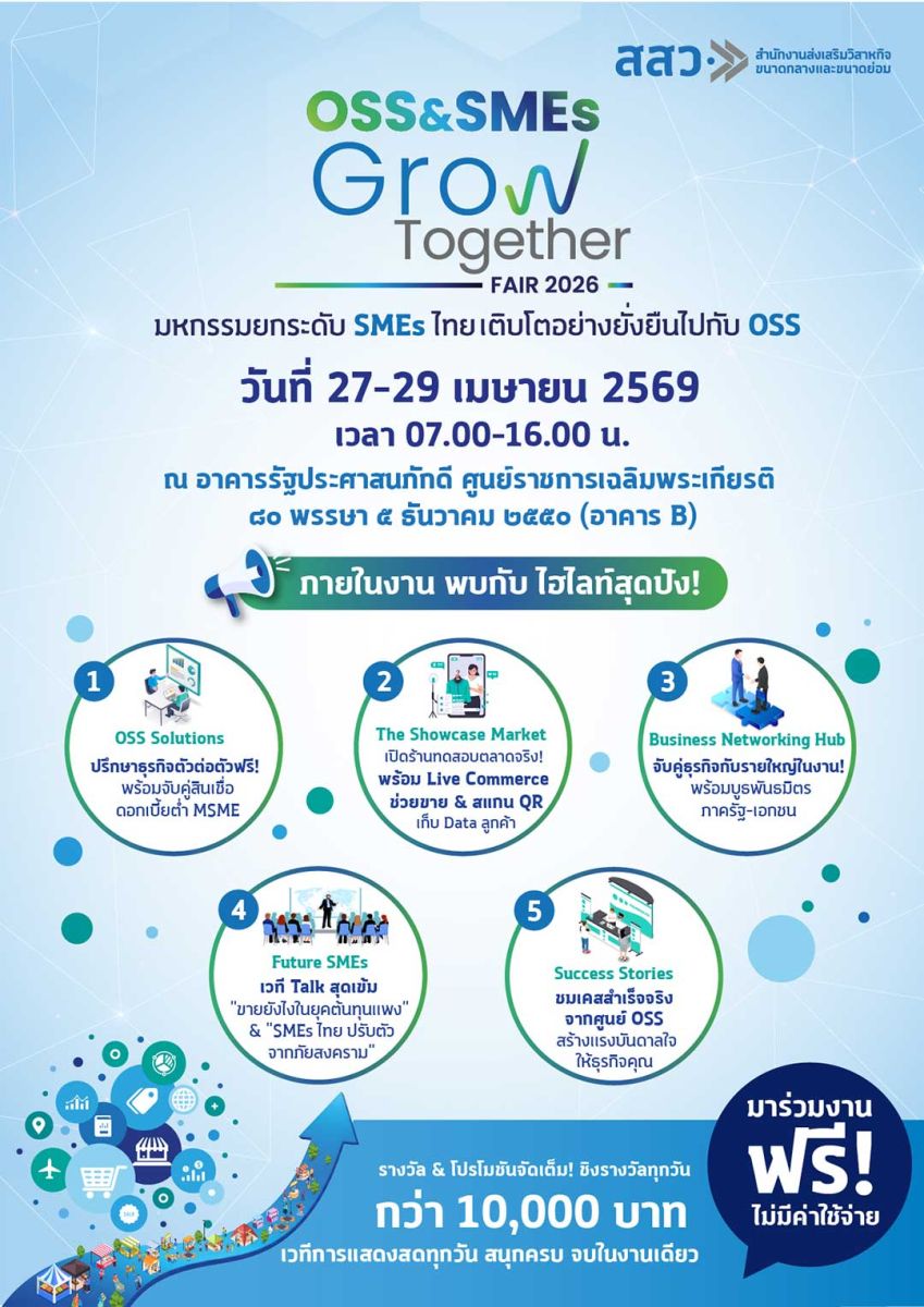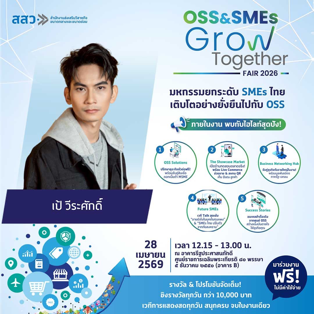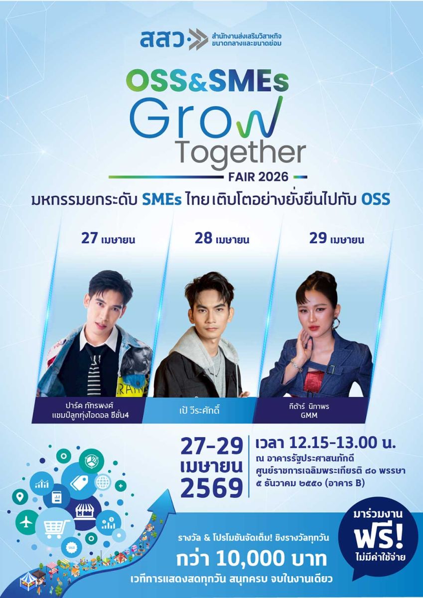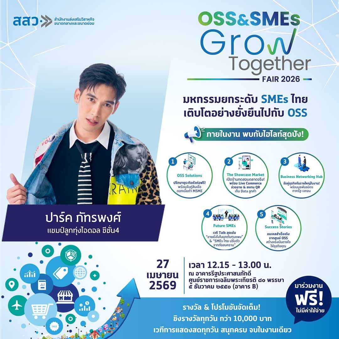 จึงขอเชิญชวนประชาชนทั่วไปเข้าร่วมชม ชิม ช้อป และให้กำลังใจผู้ประกอบการไทยได้ภายในงาน “OSS & SMEs GROW TOGETHER FAIR 2026” ระหว่างวันที่ 27–29 เมษายน 2569 ณ ศูนย์ราชการเฉลิมพระเกียรติฯ อาคารบี ถนนแจ้งวัฒนะ เข้าร่วมงานได้โดยไม่เสียค่าใช้จ่าย