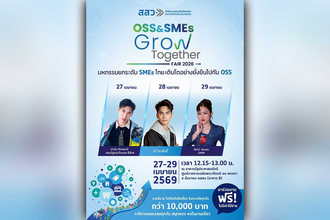 กรุงเทพฯ – สำนักงานส่งเสริมวิสาหกิจขนาดกลางและขนาดย่อม (สสว.) ประกาศความพร้อมจัดงานมหกรรม “OSS & SMEs GROW TOGETHER FAIR 2026” ภายใต้แนวคิด “สร้างโอกาสและเติบโตไปกับ OSS” รวบรวมสุดยอดผู้ประกอบการ SME คุณภาพจาก 77 จังหวัดทั่วประเทศกว่า 280 ร้านค้า พร้อมเปิดดีลธุรกิจ Business Matching ยกระดับมาตรฐาน SME ไทยสู่สากล ระหว่างวันที่ 27 – 29 เมษายน 2569 ณ อาคารรัฐประศาสนภักดี (อาคาร B) ศูนย์ราชการเฉลิมพระเกียรติฯ ถนนแจ้งวัฒนะ