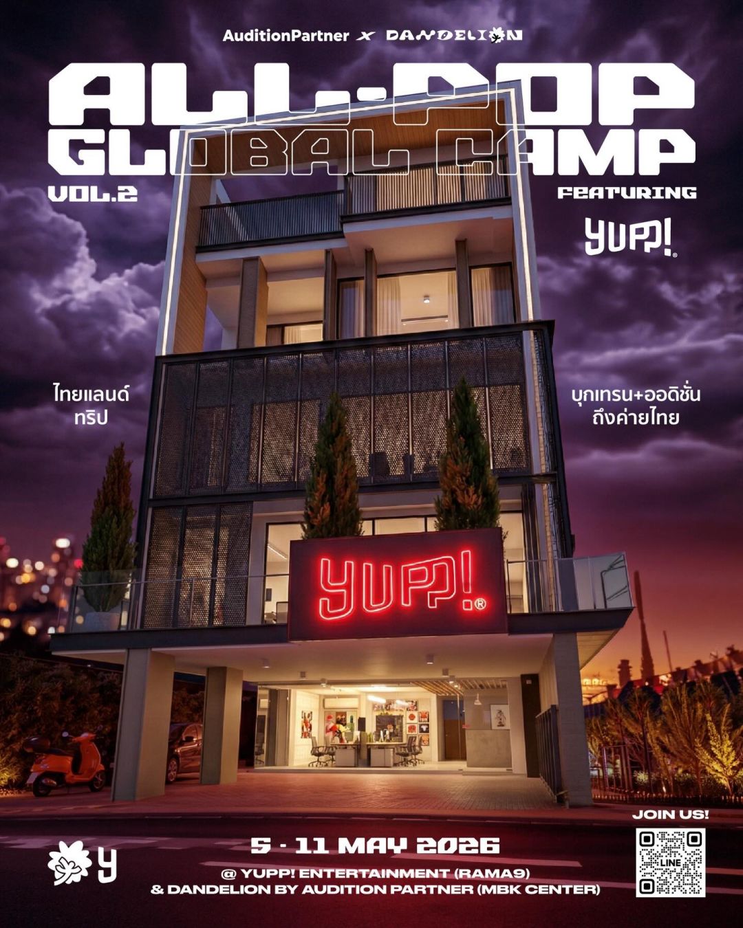 ALL-POP GLOBAL CAMP VOL.2 จะมีขึ้นระหว่างวันที่ 5-11 พฤษภาคม 2026 รับสมัครตั้งแต่วันนี้เป็นต้นไป จำนวนจำกัดเพียง 24 คนเท่านั้น สมัครด่วนๆ ทาง LINE O/A: @auditionpartner และ @dandelion หรือโทร. 082-173-6365