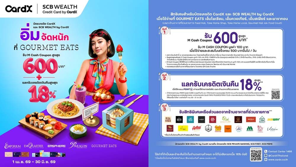 28 เมษายน 2569 บริษัท คาร์ด เอกซ์ จำกัด (CardX) ผู้ให้บริการบัตรเครดิตและสินเชื่อบุคคลภายใต้กลุ่มเอสซีบีเอกซ์ เดินหน้าตอกย้ำความเป็นผู้นำด้านไลฟ์สไตล์การเงินระดับพรีเมียม ร่วมกับ กูร์เมต์ อีทส์ (Gourmet Eats) ธุรกิจอาหารในเครือเดอะมอลล์ กรุ๊ป เพื่อเอาใจนักชิมให้เพลิดเพลินกับร้านดังและเมนูฮิตแบบจัดเต็ม จัดแคมเปญพิเศษ “อิ่มจัดหนัก ที่ Gourmet Eats” มอบสิทธิประโยชน์สุดเอ็กซ์คลูซีฟ เพื่อเติมเต็มประสบการณ์ การรับประทานอาหารให้คุ้มค่ายิ่งขึ้น สำหรับบัตรเครดิต CardX และ SCB WEALTH by CardX ที่ กูร์เมต์ อีทส์ สาขาเอ็มโพเรียม, เอ็มควอเทียร์, เอ็มสเฟียร์ และ พารากอน ตั้งแต่วันที่ 1 เมษายน – 30 มิถุนายน 2569