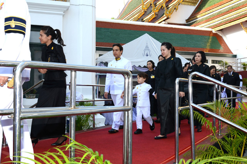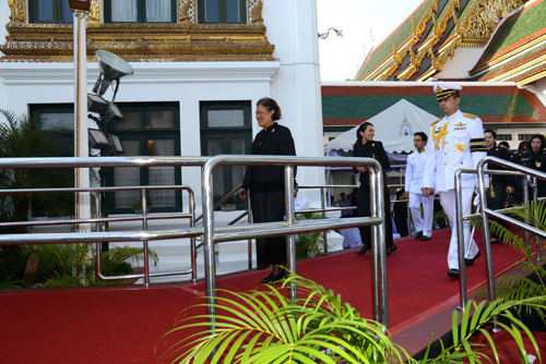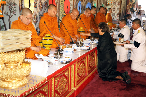 23 ต.ค.59 เมื่อเวลา 07.04 น.สมเด็จพระเทพรัตนราชสุดาฯ สยามบรมราชกุมารี เสด็จพระราชดำเนินไปยังพระที่นั่งดุสิตมหาปราสาท ในพระบรมมหาราชวัง พร้อมด้วย คุณพลอยไพลิน เจนเซน และคุณสิริกิติยา เจนเซน พระธิดาในทูลกระหม่อมหญิงอุบลรัตนราชกัญญา สิริวัฒนาพรรณวดี ทรงบำเพ็ญพระราชกุศลถวายภัตตาหารเช้าแด่พระพิธีธรรม ทรงจุดธูปเทียนเครื่องทองน้อย หน้าพระบรมศพพระบาทสมเด็จพระปรมินทรมหาภูมิพลอดุลยเดช ทรงกราบ ทรงจุดธูปเทียนบูชาพระพุทธรูปประจำพระชนวารเป็นพระพุทธรูปประทับยืนแบบสมภังค์ แสดงปางห้ามญาติหรืออภัยมุทราด้วยพระหัตถ์ขวาเพียงข้างเดียว ที่หน้าพระแท่นนพปฎลมหาเศวตฉัตร จากนั้นประเคนสำรับภัตตาหารแด่พระพิธีธรรม 8 รูป จากวัดบวรนิเวศราชวรวิหาร และวัดประยุรวงศาวาสวรวิหาร ที่สวดมาตั้งแต่ค่ำวันที่ 22 ต.ค.แล้วเสด็จพระราชดำเนินกลับในเวลา 07.58 น.