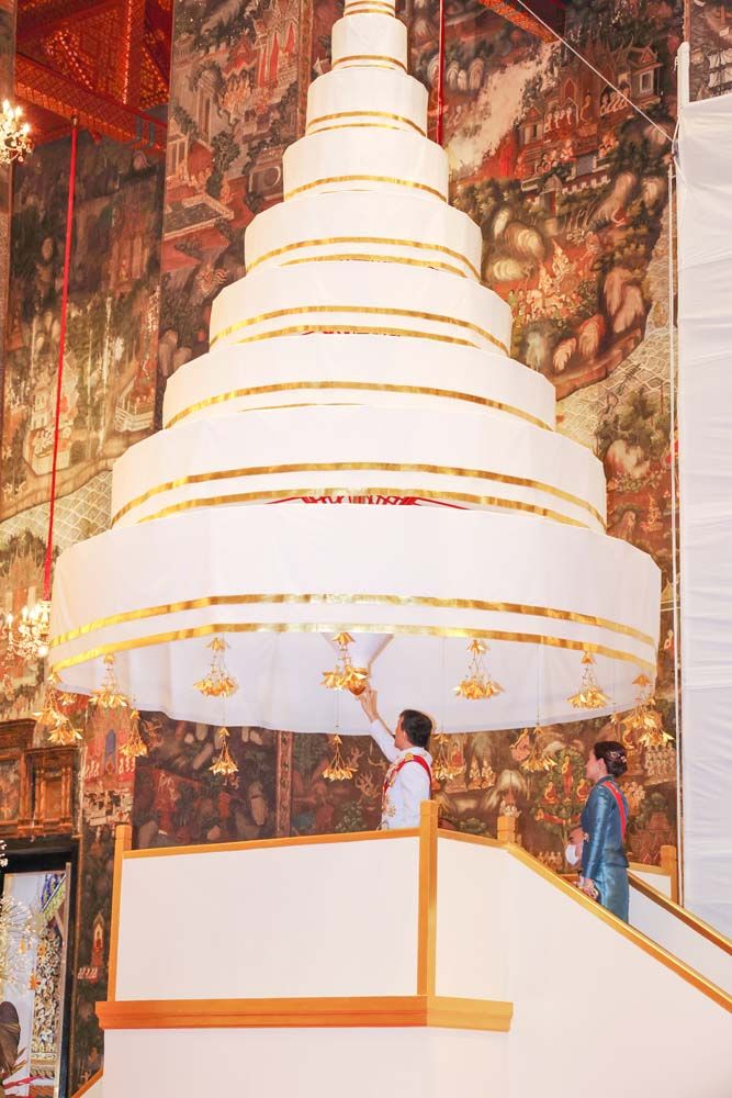 เมื่อเสด็จถึงพระวิหารหลวง พระบาทสมเด็จพระเจ้าอยู่หัว เสด็จฯไปยังที่ประดิษฐานพระนพปฎลมหาเศวตฉัตร ทรงพระสุหร่าย ทรงเจิมที่กำพูพระนพปฎลมหาเศวตฉัตร ทรงถือสายสูตรยกพระนพปฎลมหาเศวตฉัตร ขึ้นกางกั้นเหนือพระพุทธศรีศากยมุนี พระประธานพระวิหารหลวง