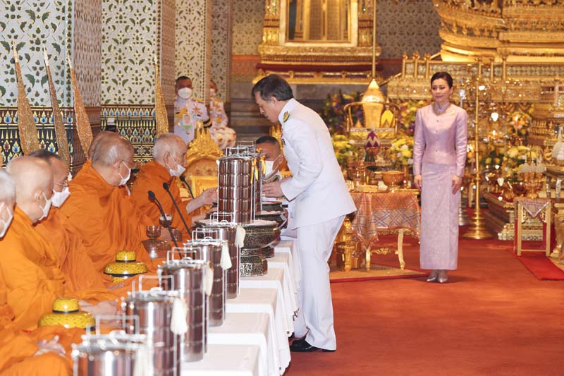 เสร็จแล้ว เสด็จพระราชดำเนินไปยังพระที่นั่งอมรินทรวินิจฉัย ทรงจุดธูปเทียนเครื่องนมัสการพานทองสองชั้นบูชาพระพุทธรูปประจำพระชนมวาร รัชกาลที่ 1 - รัชกาลที่ 9 ที่หน้าพระที่นั่งบุษบกมาลา พระสงฆ์ถวายศีลและถวายพรพระ จบแล้ว เสด็จพระราชดำเนินไปทรงจุดธูปเทียนที่พนมข้าวบิณฑ์หน้าพระที่นั่งบุษบกมาลา แล้วเสด็จพระราชดำเนินไปทรงประเคนปิ่นโตภัตตาหารแด่ประธานสงฆ์ ปิ่นโตภัตตาหาร