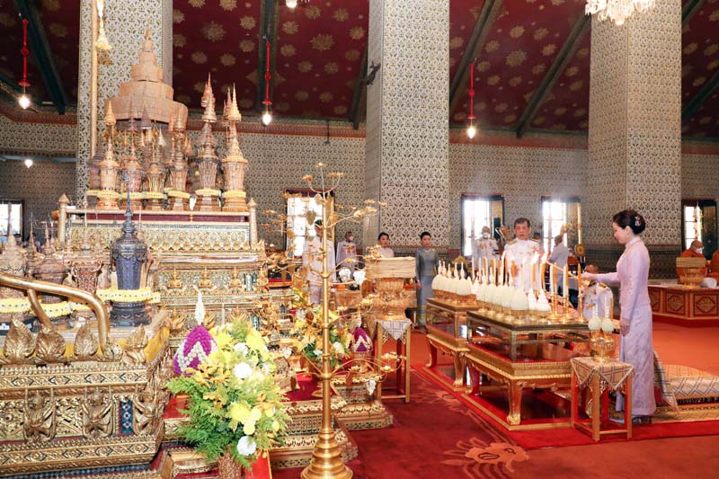 สมเด็จพระนางเจ้าฯ พระบรมราชินี ทรงจุดธูปเทียนเครื่องราชสักการะทองลงยารอง และทรงจุดธูปเทียนเครื่องทองน้อยที่หน้าพระแท่นพระนพปฎลมหาเศวตฉัตร ทรงกราบถวายบังคมพระบรมอัฐิ และพระอัฐิ แล้วเสด็จพระราชดำเนินไปทรงทอดผ้าคู่ถวายพระสงฆ์ พระสงฆ์สดับปกรณ์ ทรงหลั่งทักษิโณทก พระสงฆ์ถวายอนุโมทนา ถวายอดิเรก ถวายพระพรลา