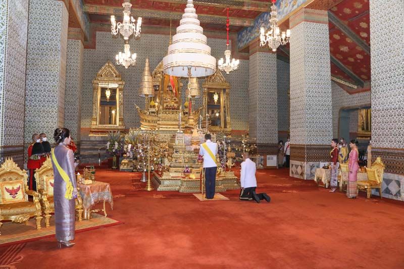 พระบาทสมเด็จพระเจ้าอยู่หัว เสด็จฯไปทรงกราบพระพุทธปฏิมาชัยวัฒน์ รัชกาลที่ 1 ถึงรัชกาลที่ 7 และรัชกาลที่ 9 ที่หน้าพระที่นั่งบุษบกมาลา ทรงรับการถวายความเคารพของผู้มาเฝ้าฯ แล้วเสด็จออกจากพระที่นั่งอมรินทรวินิจฉัย ประทับรถยนต์พระที่นั่ง เสด็จพระราชดำเนินกลับ