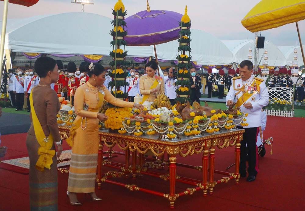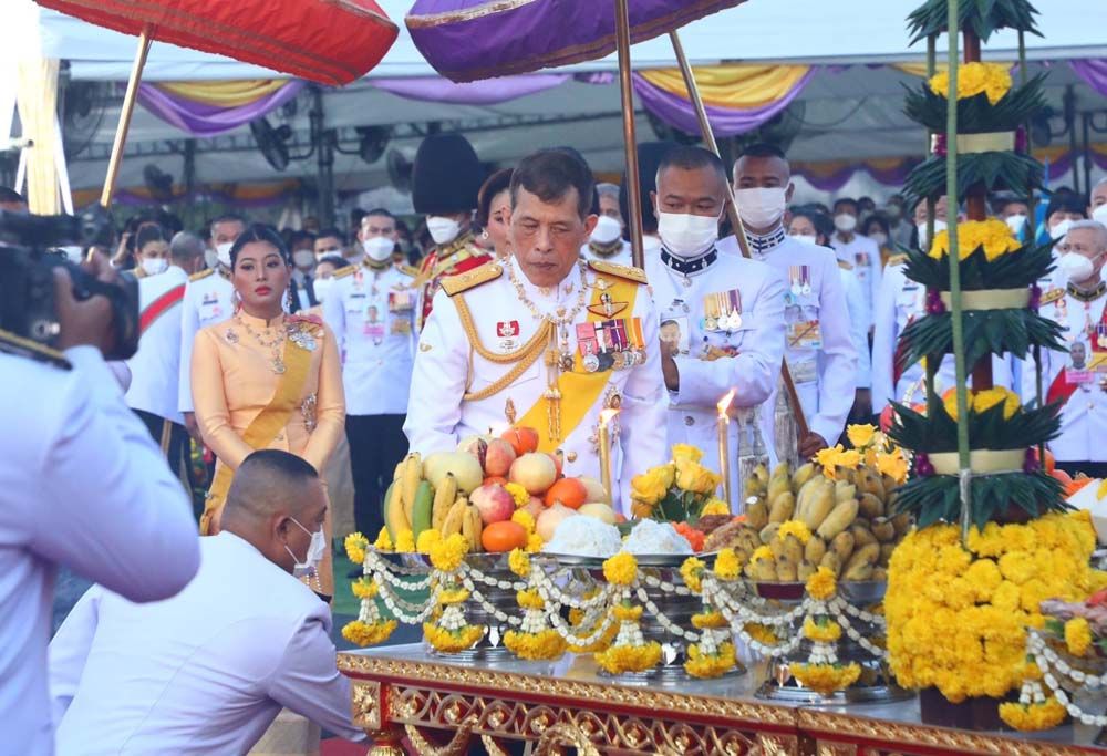 พระบาทสมเด็จพระเจ้าอยู่หัว ทรงจุดธูปเทียนเครื่องนมัสการบูชาพระรัตนตรัย ทรงกราบ ประทับพระราชอาสน์ ทรงศีล ประธานสงฆ์ถวายศีลจบ เสด็จออกจากพลับพลาพิธี ไปยังมณฑลพิธีบวงสรวง เสด็จฯ ไปยังโต๊ะเครื่องบวงสรวงสังเวย พระบาทสมเด็จพระเจ้าอยู่หัว ทรงจุดเทียนทอง เทียนเงิน และธูปที่โต๊ะเครื่องบวงสรวงสังเวย แล้วทรงจุดธูปหางปักที่เครื่องสังเวย ขณะนี้ โหรหลวงลั่นฆ้องชัย พรมหมณ์เป่าสังข์ พนักงานภูษามาลาแกว่งบัณเฑาะว์ ชาวพนักงานประโคมแตร ดุริยางค์