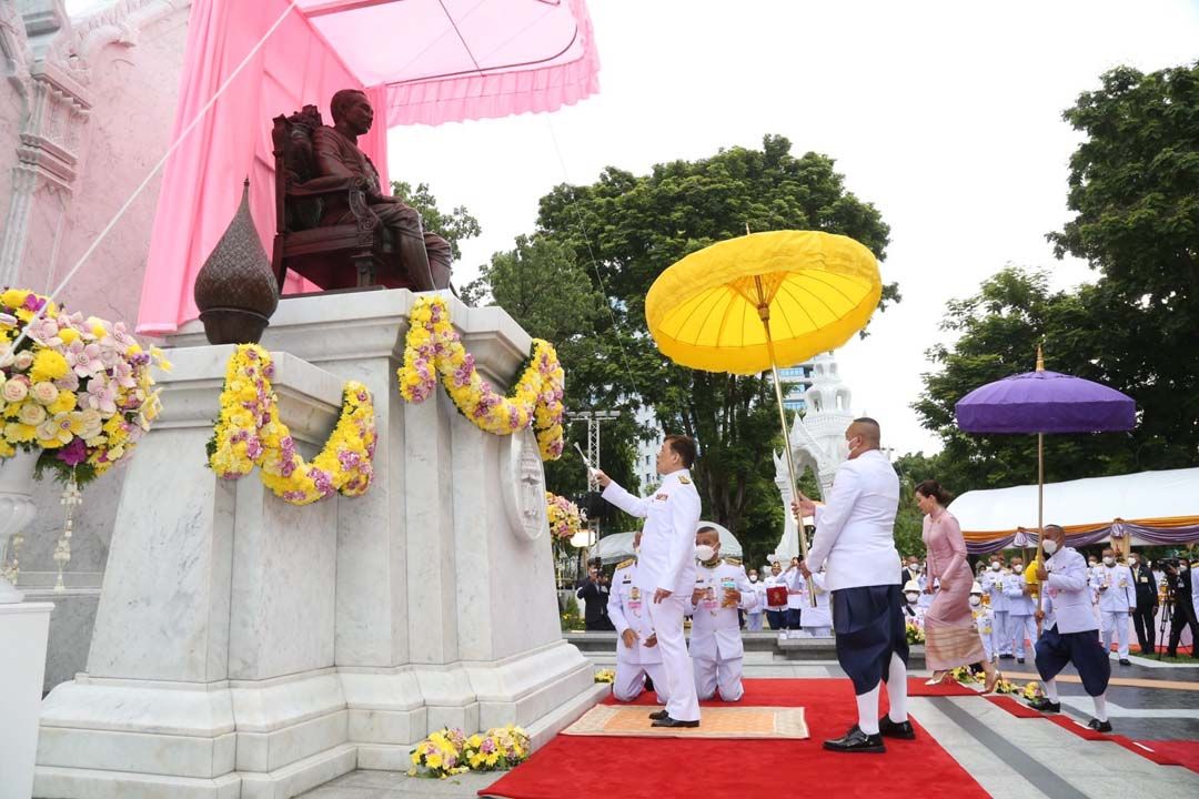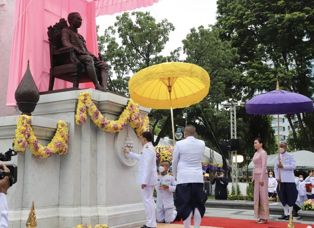 จากนั้น เสด็จออกจากพลับพลาพิธี ไปยังแท่น ทรงกดปุ่มไฟฟ้าเปิดแพรคลุมพระบรมรูปพระบาทสมเด็จพระจุลจอมเกล้าเจ้าอยู่หัว เสด็จขึ้นลานพระบรมราชานุสาวรีย์ฯ ทรงเจิมแท่นฐานพระบรมราชานุสาวรีย์ พระบาทสมเด็จพระเจ้าอยู่หัว และสมเด็จพระนางเจ้าฯ พระบรมราชินี ทรงวางพุ่มดอกไม้ทรงจุดธูปเทียนเครื่องทองน้อยถวายราชสักการะ