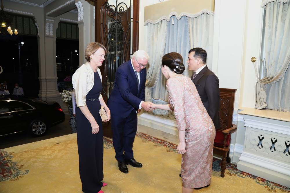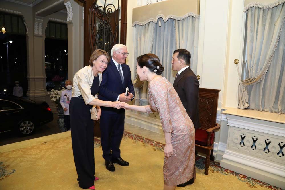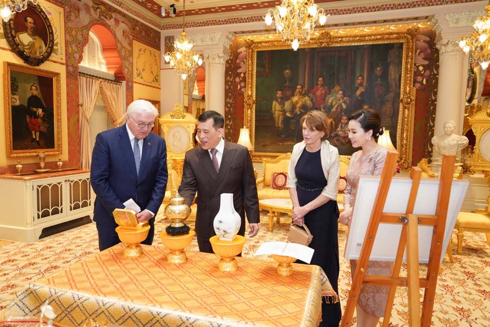 วันที่ 25 มกราคม 2567 เวลา 18.25 น. พระบาทสมเด็จพระเจ้าอยู่หัว และสมเด็จพระนางเจ้า ฯ พระบรมราชินี เสด็จออก ณ พระที่นั่งอัมพรสถาน พระราชวังดุสิต ทรงรับนายฟรังค์-วัลเทอร์ ชไตน์ไมเออร์ (His Excellency Dr.Frank-Walter Steinmeier) ประธานาธิบดีแห่งสหพันธ์สาธารณรัฐเยอรมนี และนางเอ็ลเคอ บือเดินเบนเดอร์ (Mrs. Elke Büdenbender) ภริยา ในโอกาสเดินทางมาเยือนประเทศไทยอย่างเป็นทางการ ในฐานะแขกของรัฐบาล (Official Visit) ระหว่างวันที่ 24 – 26 มกราคม 2567 ในโอกาสนี้ พระบาทสมเด็จพระเจ้าอยู่หัว พระราชทานพระกรัณฑ์ถมตะทองลายดอกพุดตานใบเทศ และตลับถมตะทองลายดอกพุดตานใบเทศประดับเพชรแก่ประธานาธิบดีแห่งสหพันธ์สาธารณรัฐเยอรมนี และภริยา และประธานาธิบดีแห่งสหพันธ์สาธารณรัฐเยอรมนี ทูลเกล้าทูลกระหม่อมถวายภาพพิมพ์นูนต่ำภาพรัฐสภาสหพันธ์สาธารณรัฐเยอรมนี และแจกันพอร์ซเลนลวดลายต้นหญ้าและนกไอบิสสีน้ำเงินแด่พระบาทสมเด็จพระเจ้าอยู่หัว และสมเด็จพระนางเจ้า ฯ พระบรมราชินี