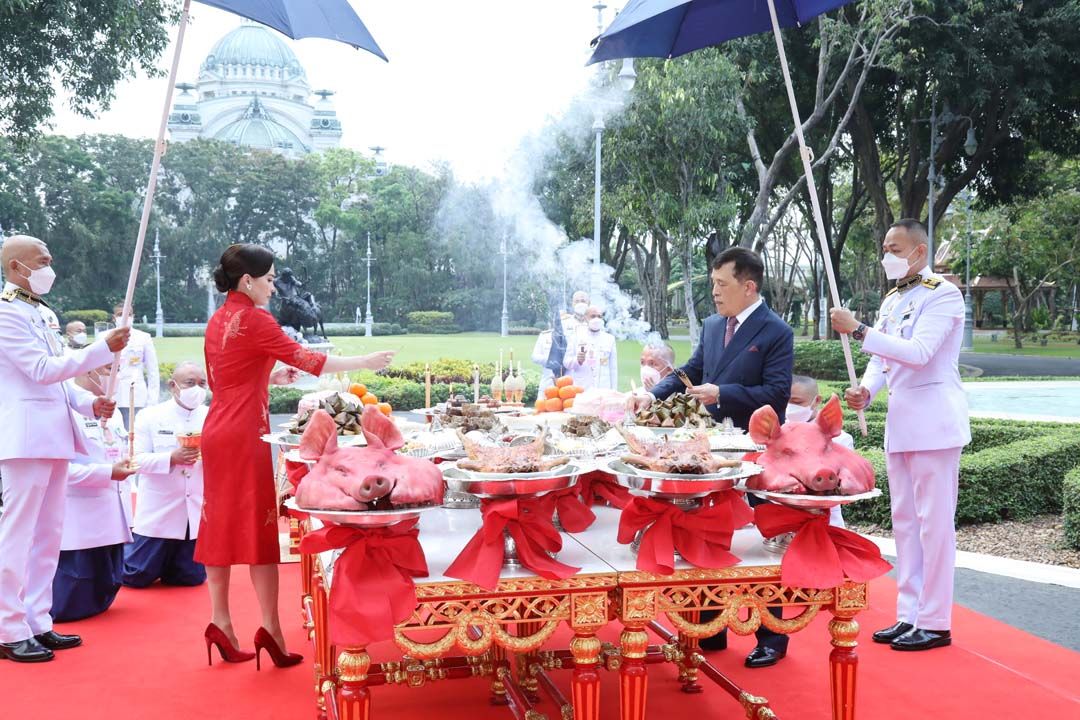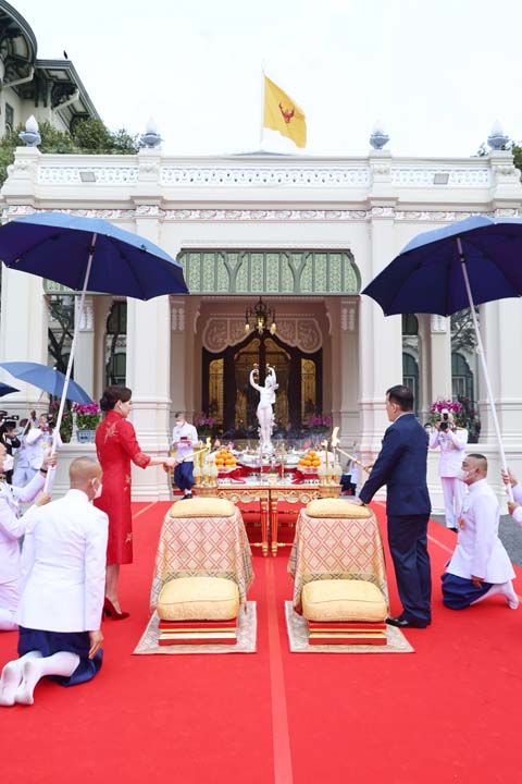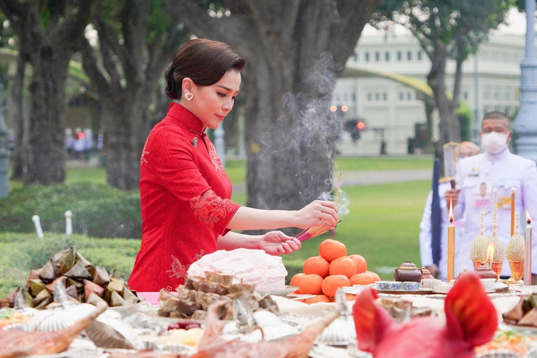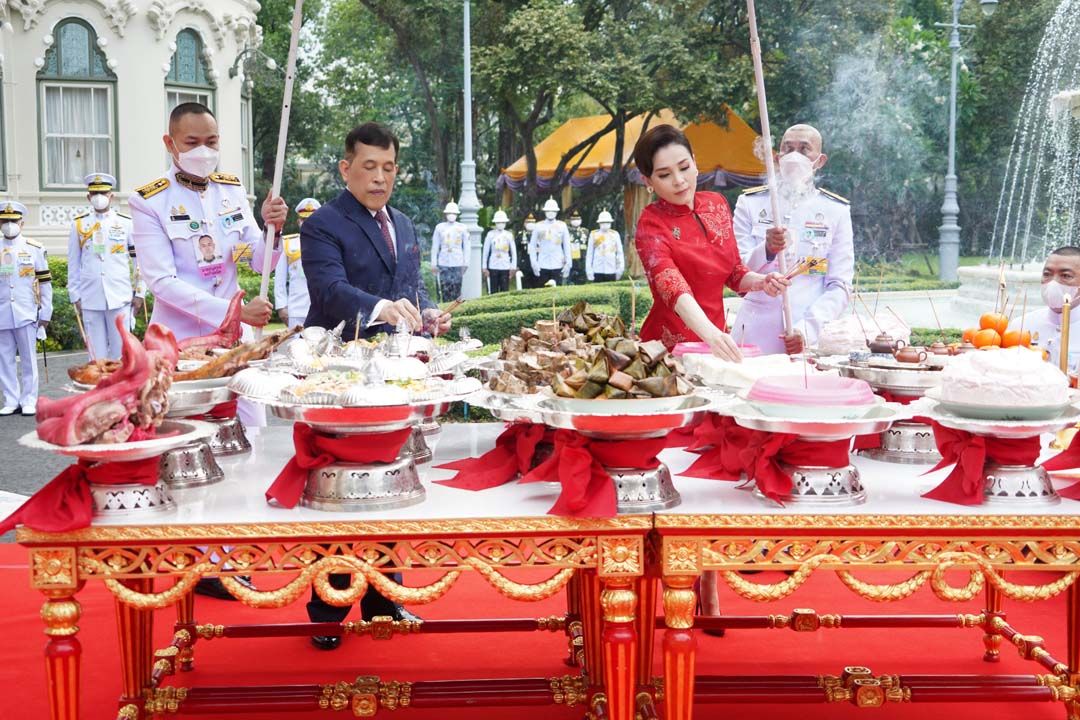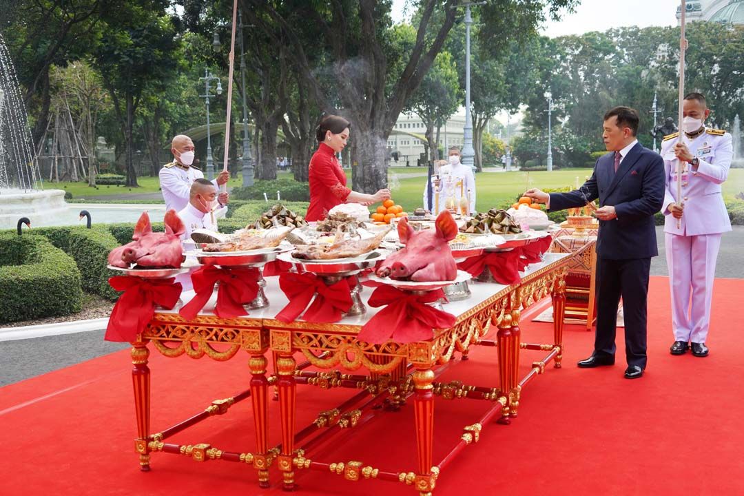 ในการนี้ พระบาทสมเด็จพระเจ้าอยู่หัว ทรงจุดเทียนทอง เทียนเงิน ธูป ที่โต๊ะเครื่องสังเวย ทรงจุดธูปหางแล้วทรงปักที่เครื่องสังเวย สมเด็จพระนางเจ้า ฯ พระบรมราชินี ทรงจุดธูปหางแล้วทรงปักที่เครื่องสังเวย จากนั้น พระบาทสมเด็จพระเจ้าอยู่หัว ทรงจุดธูปเทียนเครื่องทองน้อยถวายสักการะสิ่งศักดิ์สิทธิ์ ทรงกราบ สมเด็จพระนางเจ้า ฯ พระบรมราชินี ทรงจุดธูปเทียนเครื่องทองน้อยถวายสักการะสิ่งศักดิ์สิทธิ์ ทรงกราบ เสร็จแล้ว พระบาทสมเด็จพระเจ้าอยู่หัว และสมเด็จพระนางเจ้า ฯ พระบรมราชินี ทรงเผากระดาษเงิน กระดาษทอง สมควรแก่เวลา จึงเสด็จขึ้นพระที่นั่งอัมพรสถาน พระราชวังดุสิต