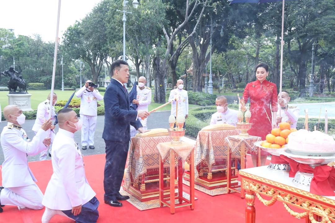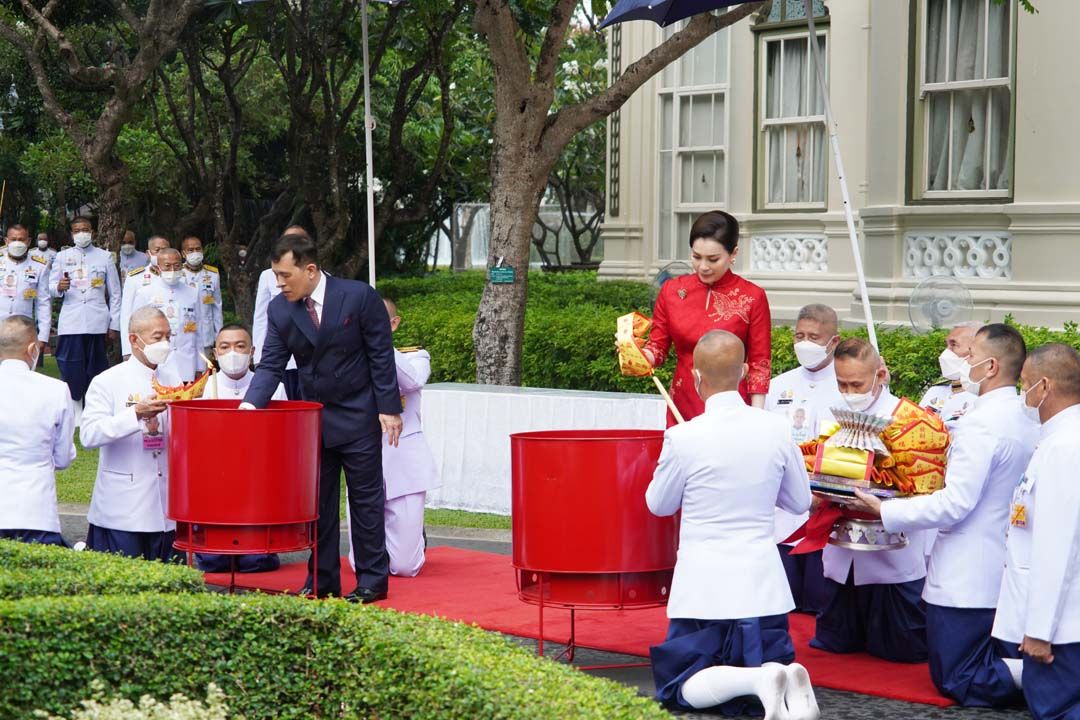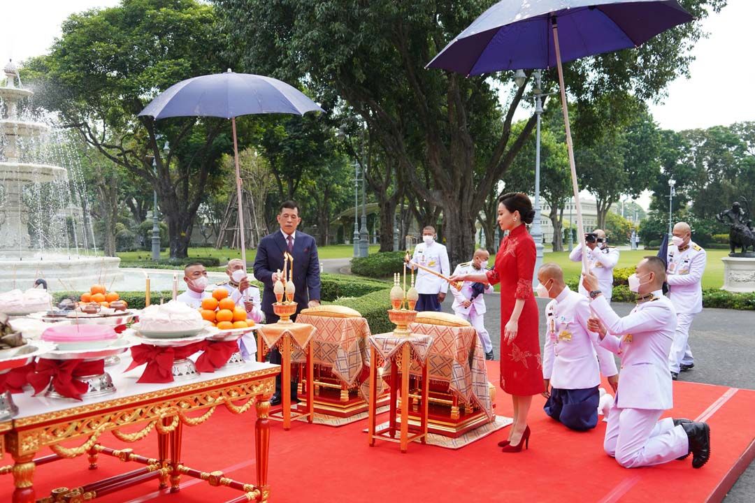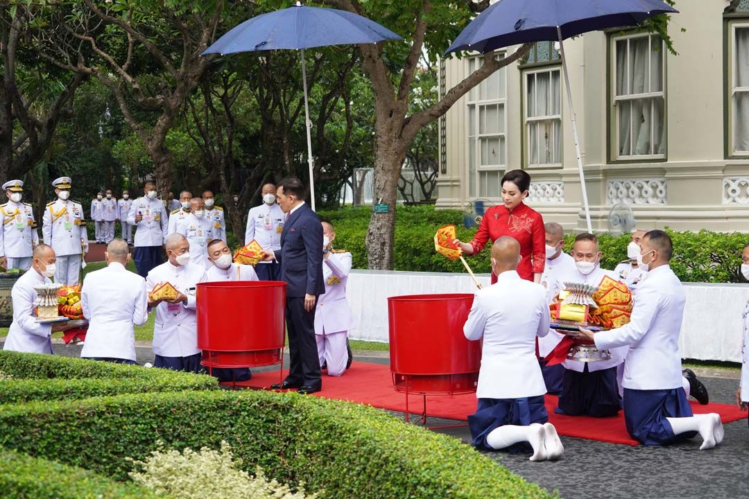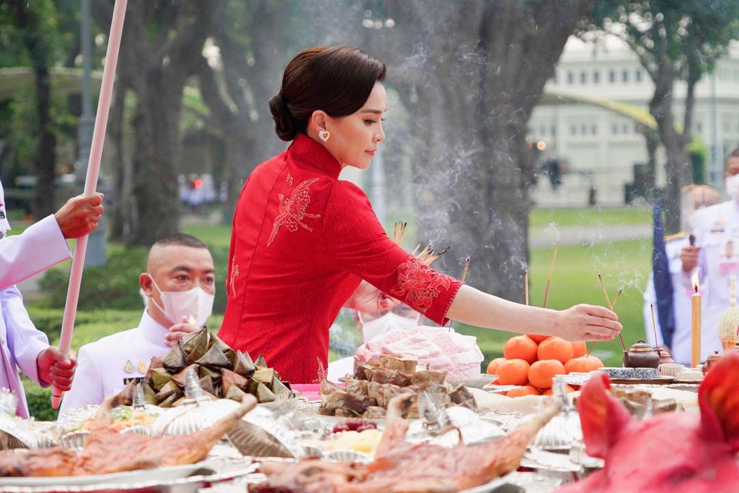 ในการนี้ พระบาทสมเด็จพระเจ้าอยู่หัว ทรงจุดเทียนทอง เทียนเงิน ธูป ที่โต๊ะเครื่องสังเวย ทรงจุดธูปหางแล้วทรงปักที่เครื่องสังเวย สมเด็จพระนางเจ้า ฯ พระบรมราชินี ทรงจุดธูปหางแล้วทรงปักที่เครื่องสังเวย จากนั้น พระบาทสมเด็จพระเจ้าอยู่หัว ทรงจุดธูปเทียนเครื่องทองน้อยถวายสักการะสิ่งศักดิ์สิทธิ์ ทรงกราบ สมเด็จพระนางเจ้า ฯ พระบรมราชินี ทรงจุดธูปเทียนเครื่องทองน้อยถวายสักการะสิ่งศักดิ์สิทธิ์ ทรงกราบ เสร็จแล้ว พระบาทสมเด็จพระเจ้าอยู่หัว และสมเด็จพระนางเจ้า ฯ พระบรมราชินี ทรงเผากระดาษเงิน กระดาษทอง สมควรแก่เวลา จึงเสด็จขึ้นพระที่นั่งอัมพรสถาน พระราชวังดุสิต