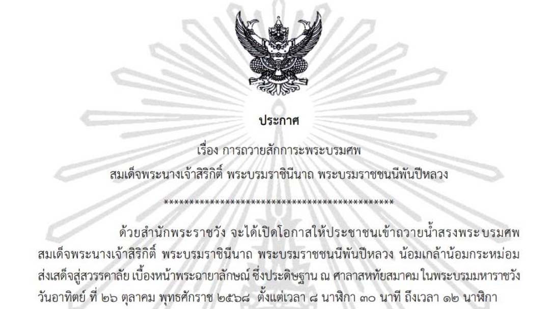 25 ตุลาคม 2568 สำนักพระราชวัง เผยแพร่ประกาศเรื่อง การถวายสักการะพระบรมศพสมเด็จพระนางเจ้าสิริกิติ์ พระบรมราชินีนาถ พระบรมราชชนนีพันปีหลวง ความว่า ด้วยสำนักพระราชวังจะได้เปิดโอกาสให้ประชาชนเข้าถวายน้ำสรงพระบรมศพสมเด็จพระนางเจ้าสิริกิติ์ พระบรมราชินีนาถ พระบรมราชชนนีทันปีหลวง น้อมเกล้าน้อมกระหม่อมส่งเสด็จสู่สวรรคาลัย เบื้องหน้าพระฉายาลักษณ์ ซึ่งประดิษฐาน ณ ศาลาสหทัยสมาคมในพระบรมมหาราชวัง วันอาทิตย์ ที่ 26 ตุลาคม พุทธศักราช 2568 ตั้งแต่เวลา 8 นาฬิกา 30 นาที ถึงเวลา 12 นาฬิกา