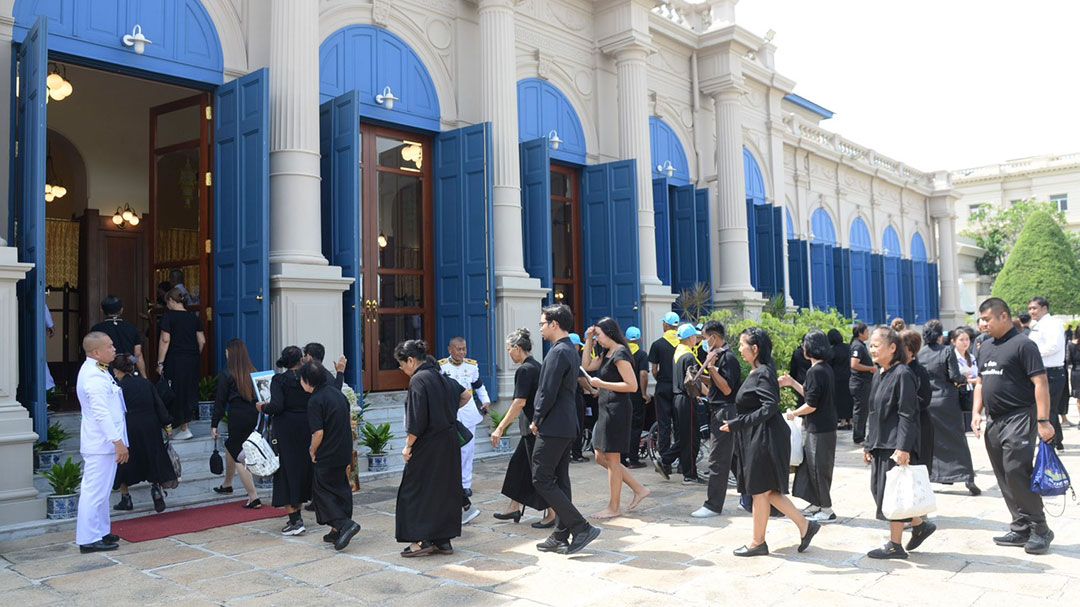 ผู้สื่อข่าวรายงานบรรยากาศที่ศาลาสหทัยสมาคม ตั้งแต่เวลา 08.30 น. สำนักพระราชวัง เปิดให้ประชาชนเข้าถวายสักการะเบื้องหน้าพระฉายาลักษณ์ สมเด็จพระบรมราชชนนีพันปีหลวง และลงนามแสดงความอาลัย ณ ศาลาสหทัยสมาคม ในพระบรมมหาราชวัง เป็นวันที่ 7 แม้อากาศจะอบอ้าว แต่มีประชาชนจำนวนมากจากทั่วสารทิศทยอยเดินแถวจากประตูมณีนพรัตน์เข้าไปในศาลาสหทัยสมาคมอย่างเป็นระเบียบเรียบร้อย ส่วนใหญ่เป็นผู้สูงอายุที่มาพร้อมบุตรหลานในวันหยุด ตั้งใจแต่งกายด้วยชุดสุภาพไว้ทุกข์ เพื่อเข้าถวายความอาลัยด้วยความเคารพยิ่งด้วยสำนึกในพระมหากรุณาธิคุณที่พระองค์มีต่อปวงชนชาวไทย