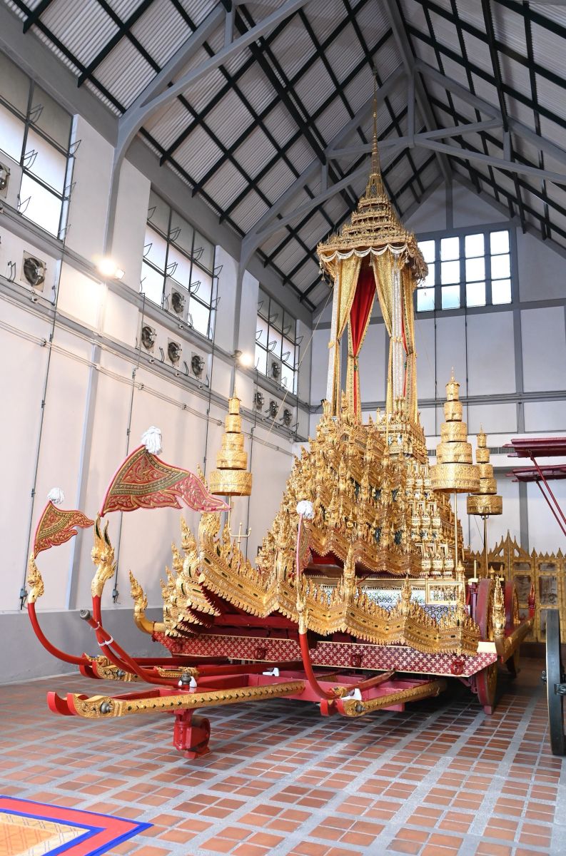 ในการนี้ เสด็จฯ เข้าภายในพระที่นั่งพุทไธสวรรย์ ทรงวางพวงมาลัยถวายสักการะพระพุทธสิหิงค์ ทรงจุดธูปเทียนเครื่องนมัสการบูชาพระพุทธสิหิงค์ จากนั้นเสด็จฯ ไปยังมณฑลพิธี ด้านหน้าโรงราชรถ ทรงจุดเทียนทอง เทียนเงิน ธูป และปักธูปหางที่เครื่องบวงสรวง ทรงจุดธูปเทียนเครื่องทองน้อย พระมหาราชครูพิธีศรีวิสุทธิคุณ อ่านโองการบวงสรวงเทพยดา และอัญเชิญดวงพระวิญญาณพระมหากษัตริยาธิราชเจ้า ทอดพระเนตรการแสดงรำบวงสรวง 1 ชุด บรรเลงเพลงสาธุการ โดยสำนักการสังคีต กรมศิลปากร เสด็จ ฯ ไปยังมณฑลพิธี ทรงสุหร่ายที่เครื่องมือช่าง ทรงโปรยข้าวตอก ดอกไม้ที่โต๊ะเครื่องบวงสรวง ทรงคล้องมาลัยที่พระมหาพิชัยราชรถ พระยานมาศสามลำคาน จำนวน 2 องค์ พระเวชยันตราชรถและราชรถน้อย จำนวน 3 องค์ ตามลำดับ และทอดพระเนตรพระราชรถ พระยานมาศ แล้วจึงเสด็จ ฯกลับ