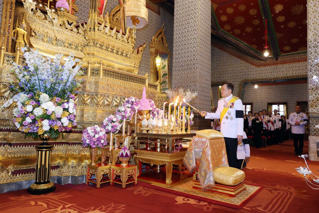 พระบาทสมเด็จพระเจ้าอยู่หัว ทรงจุดธุปเทียนเครื่องราชสักการะทองลงยาราชวดี และทรงจุดธูปเทียนเครื่องทองน้อยกราบถวายบังคมพระอัฐิสมเด็จพระเจ้าภคินีเธอ เจ้าฟ้าเพชรรัตนราชสุดา สิริโสภาพัณณวดี ซึ่งประดิษฐานที่พระแท่นพระนพปฎลมหาเศวตฉัตร ทรงกราบ จากนั้น สมเด็จพระนางเจ้าฯ พระบรมราชินี ทรงจุดธูปเทียนเครื่องราชสักการะทองลงยารอง และทรงจุดธูปเทียนเครื่องทองน้อยกราบถวายบังคมพระอัฐิ ทรงกราบ เสร็จแล้ว ทรงรับการถวายความเคารพของผู้มาเฝ้าฯ ประทับพระราชอาสน์