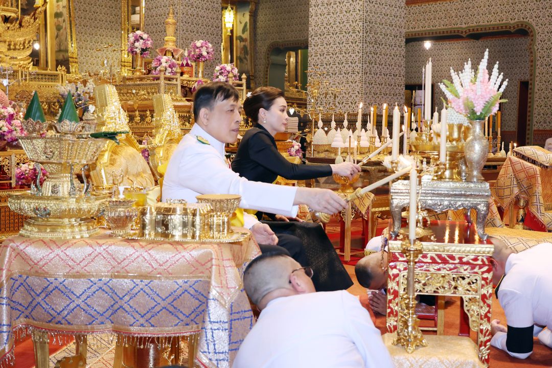 เมื่อเสด็จพระราชดำเนินถึง สมเด็จพระนางเจ้าฯ พระบรมราชินี ประทับยืนหน้าพระราชอาสน์ ทรงจุดธูปเทียนเครื่องนมัสการพานทองสองชั้นบูชาพระพุทธปฏิมาชัยวัฒน์ ประจำรัชกาลที่ 6 และพระพุทธรูปประจำวันประสูติของพระอัฐิสมเด็จพระเจ้าภคินีเธอ เจ้าฟ้าเพชรรัตนราชสุดา สิริโสภาพัณณวดี ซึ่งประดิษฐานในพระที่นั่งบุษบกมาลา ทรงกราบ